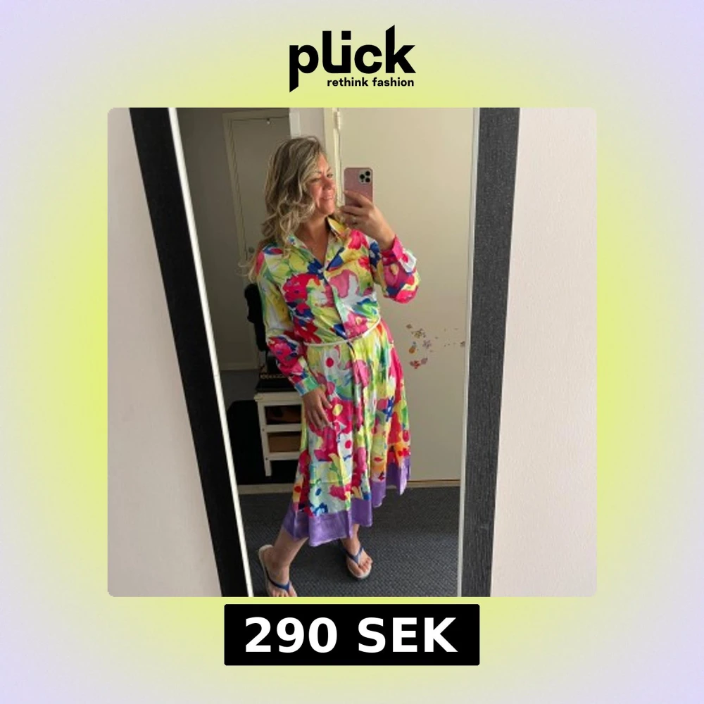 Superfin långklänning med färgglatt blommigt mönster i rosa, lila, blått, gult och vitt. Klänningen har lång ärm, krage, knappar framtill och lila kant nertill. Skön och luftig passform, perfekt för vår och sommar.Helt ny.Storlek märkt som S men den är 38 som motsvarar M.Bälte ej ingår