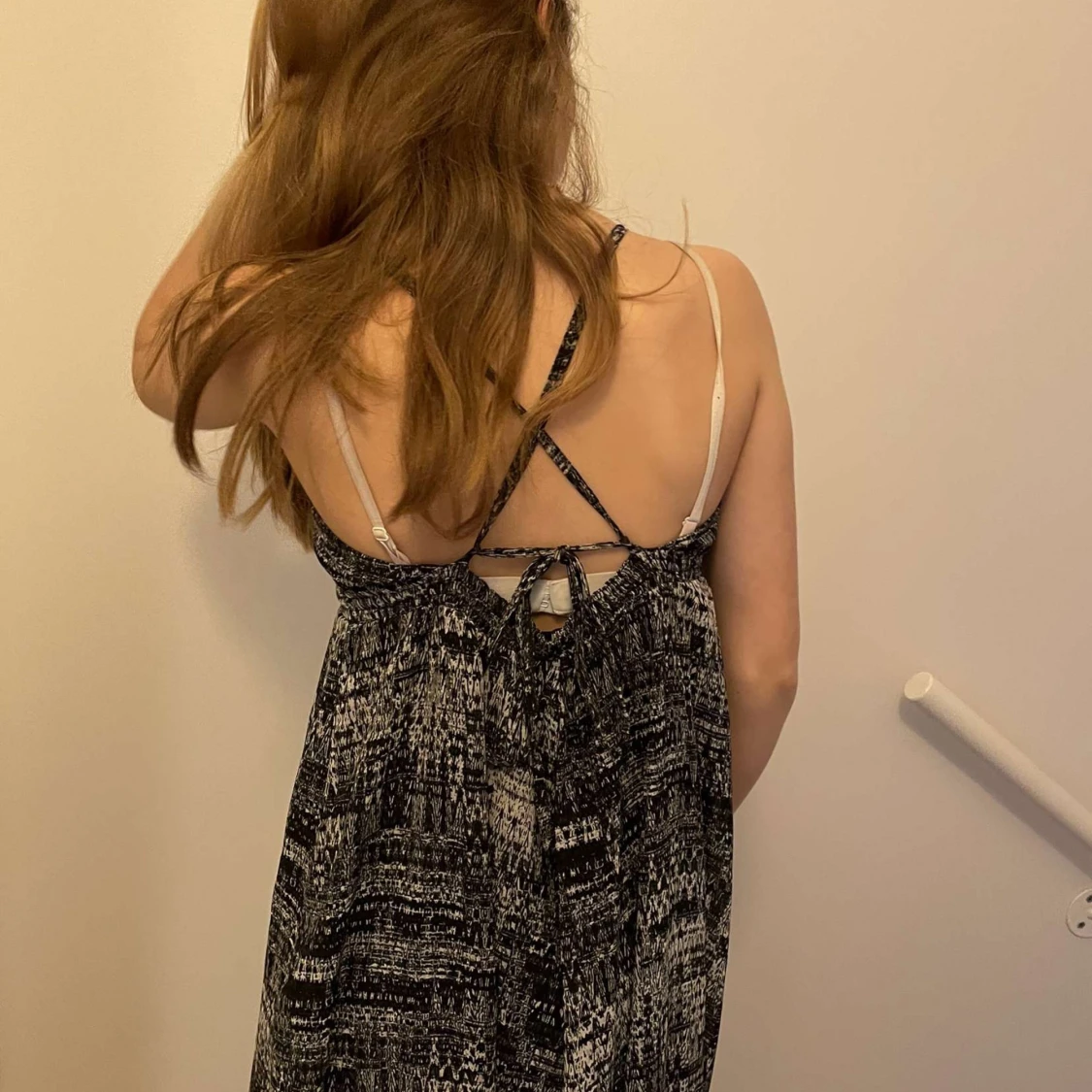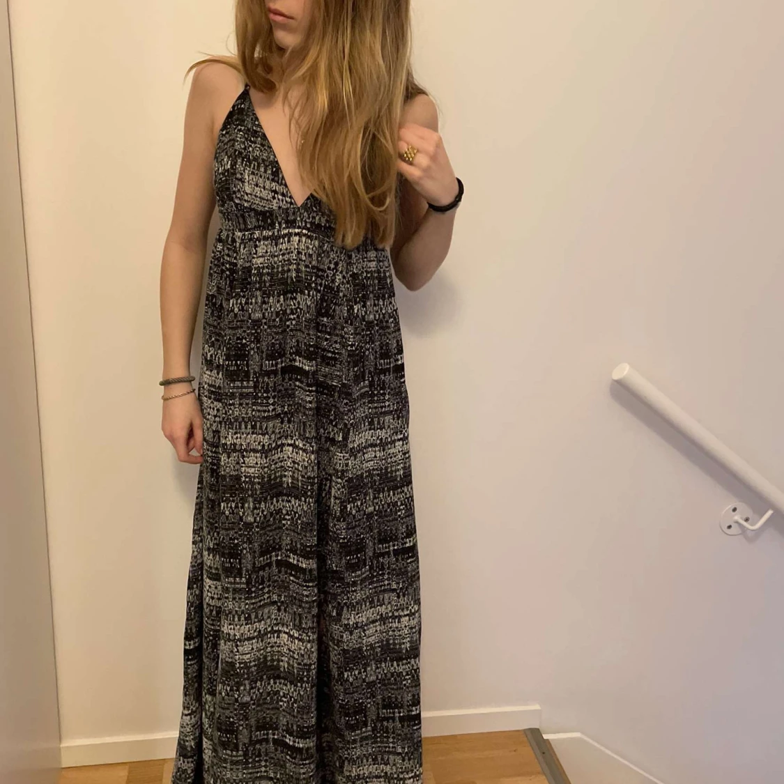 Världens finaste låna klänning med V-ringning. Den är öppen i ryggen och har slits längst ned. Banden går att justera!