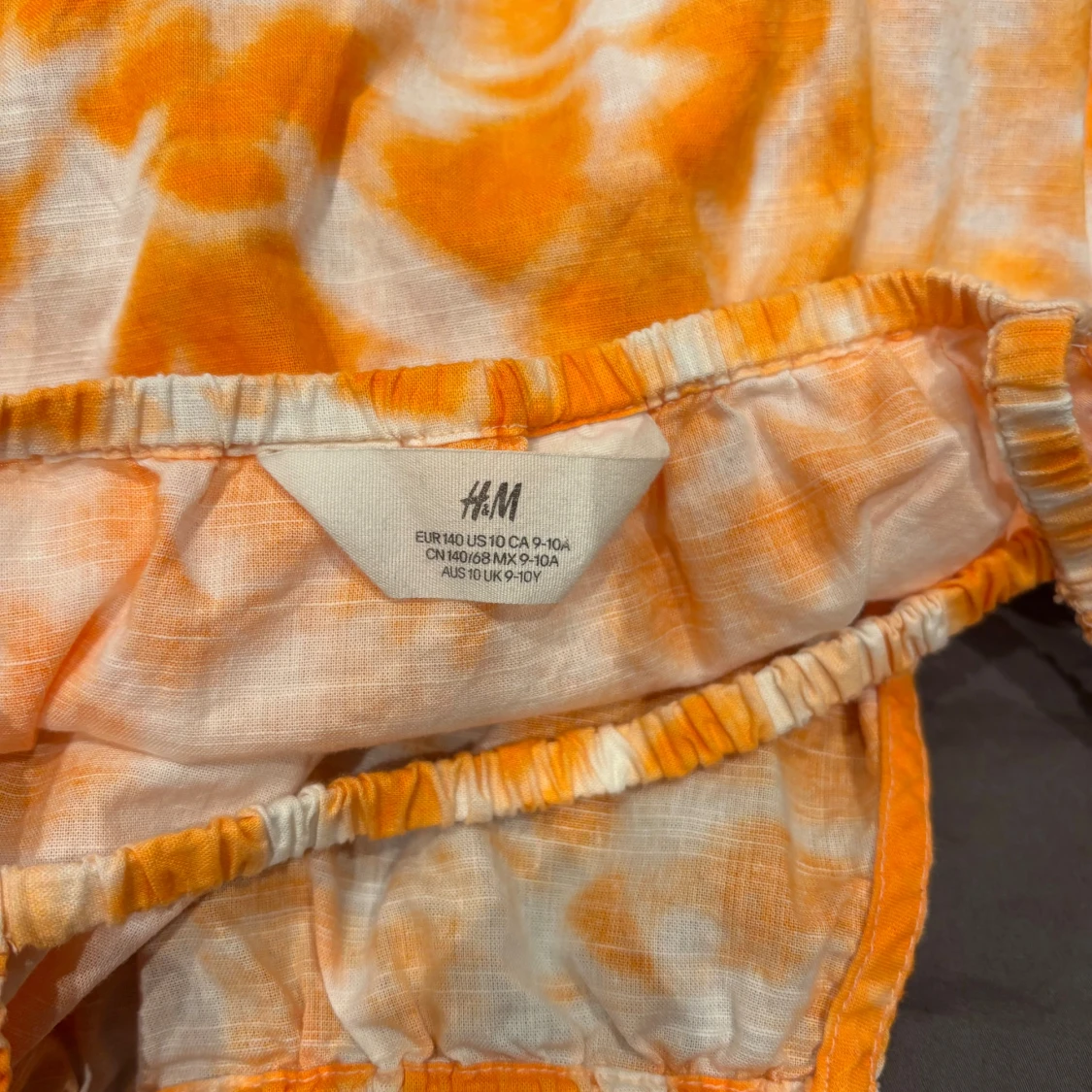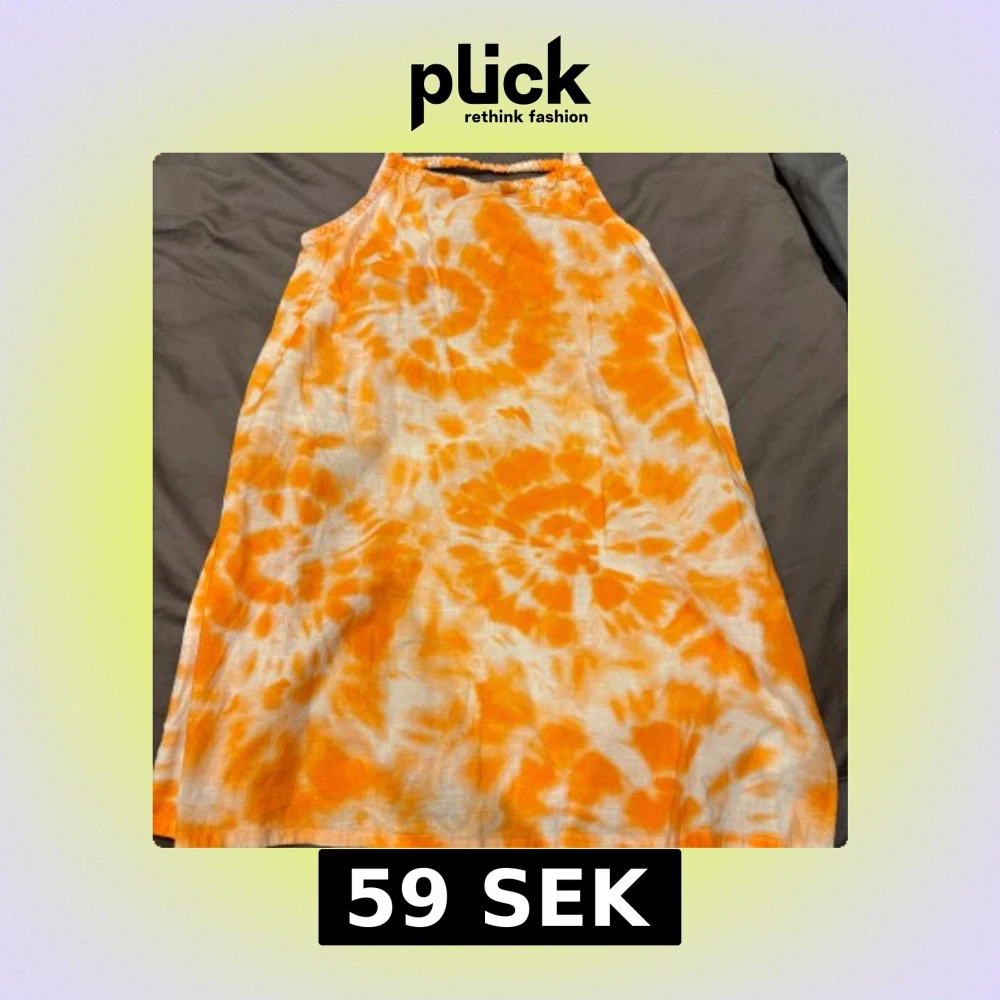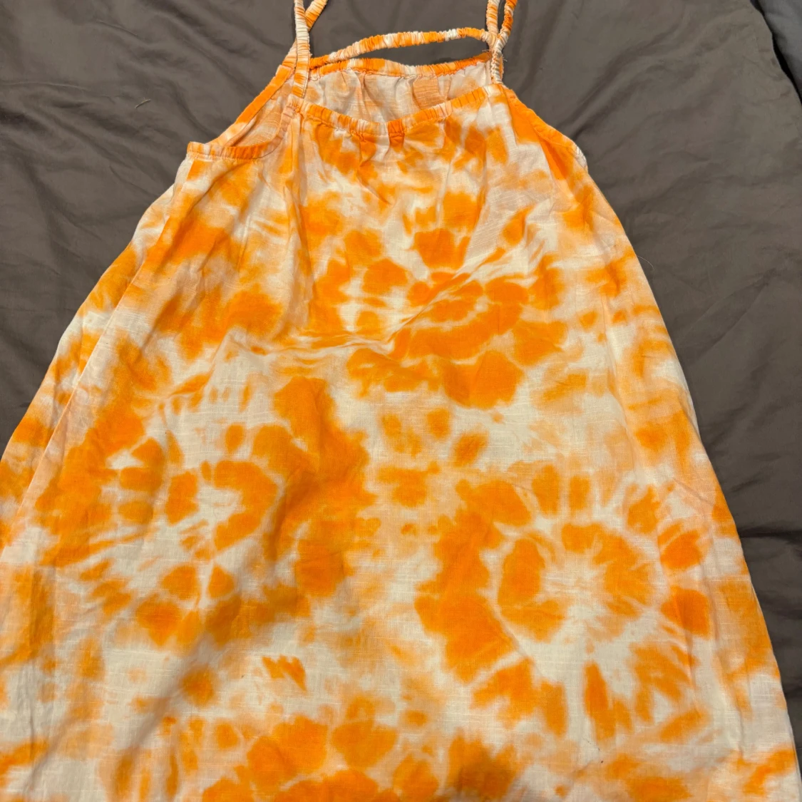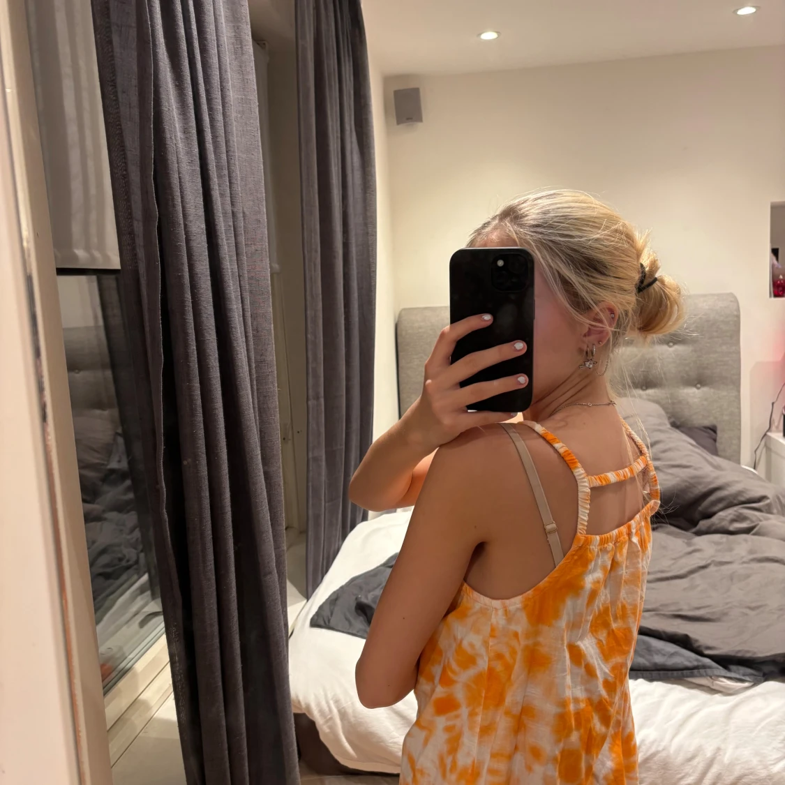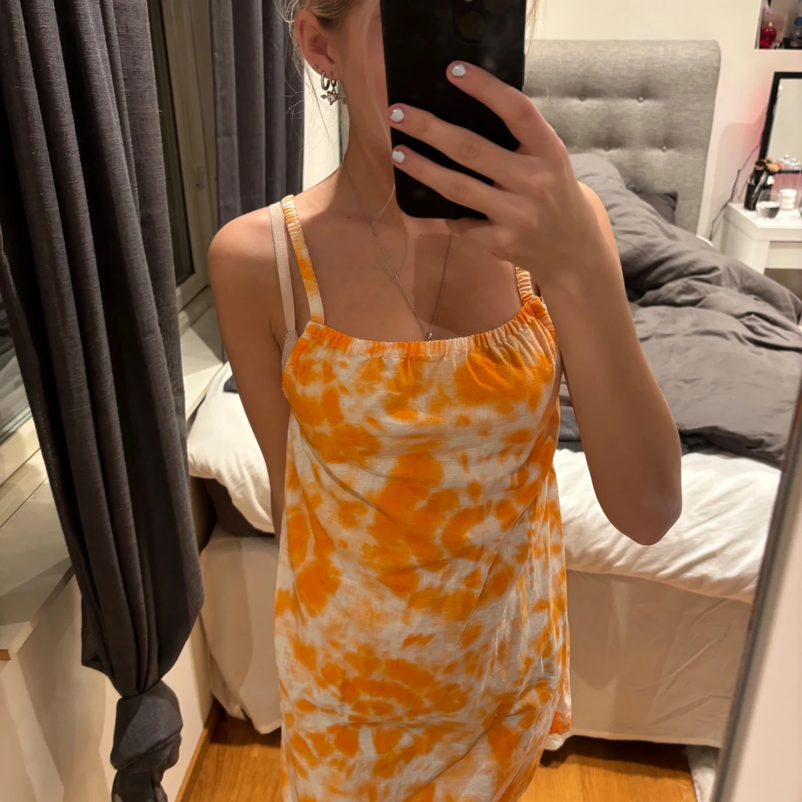 Superfin kort klänning från H&M i orange och vitt tie-dye mönster. Den har smala axelband och en avslappnad passform, perfekt för varma dagar. Materialet är lätt och luftigt, vilket gör den skön att bära under sommaren.