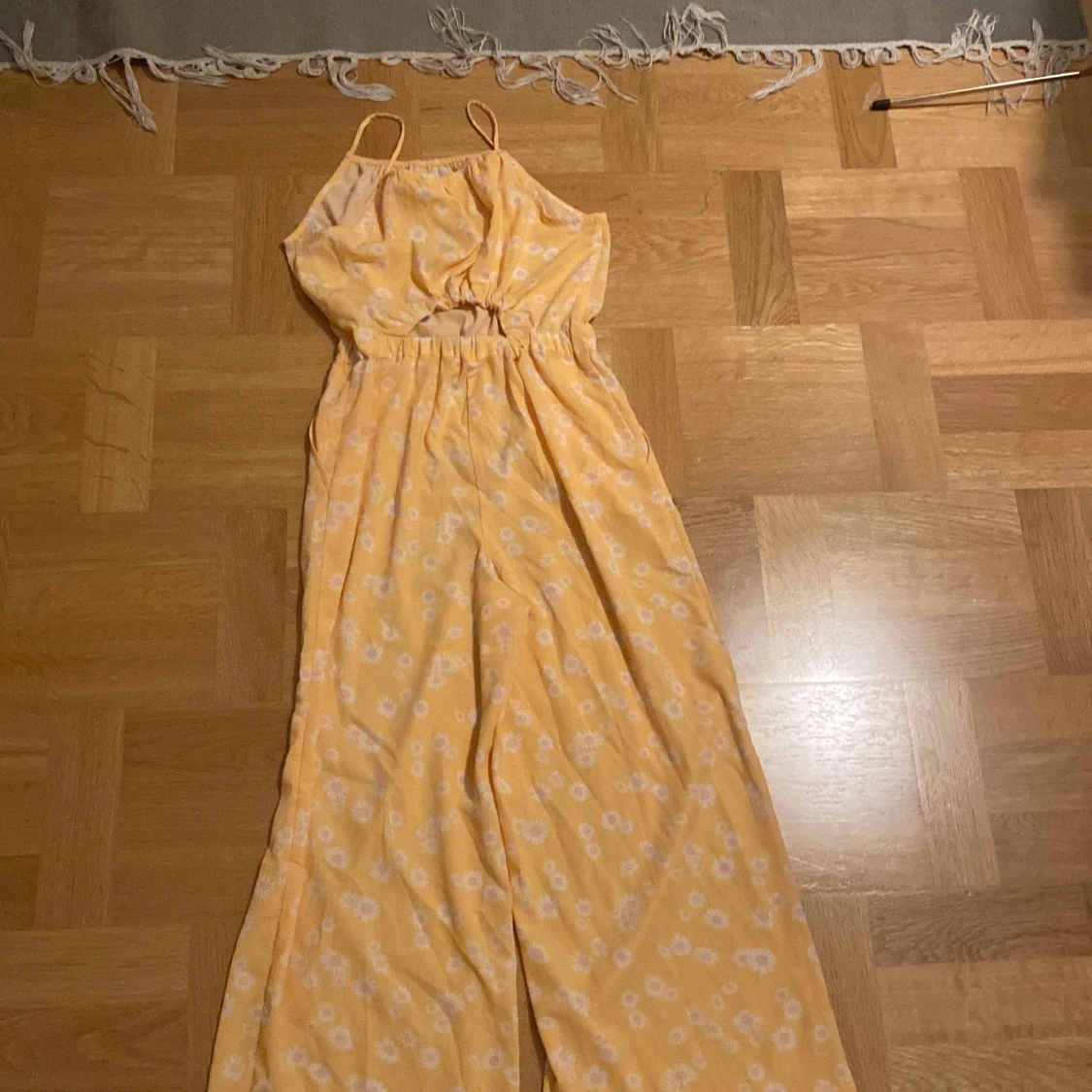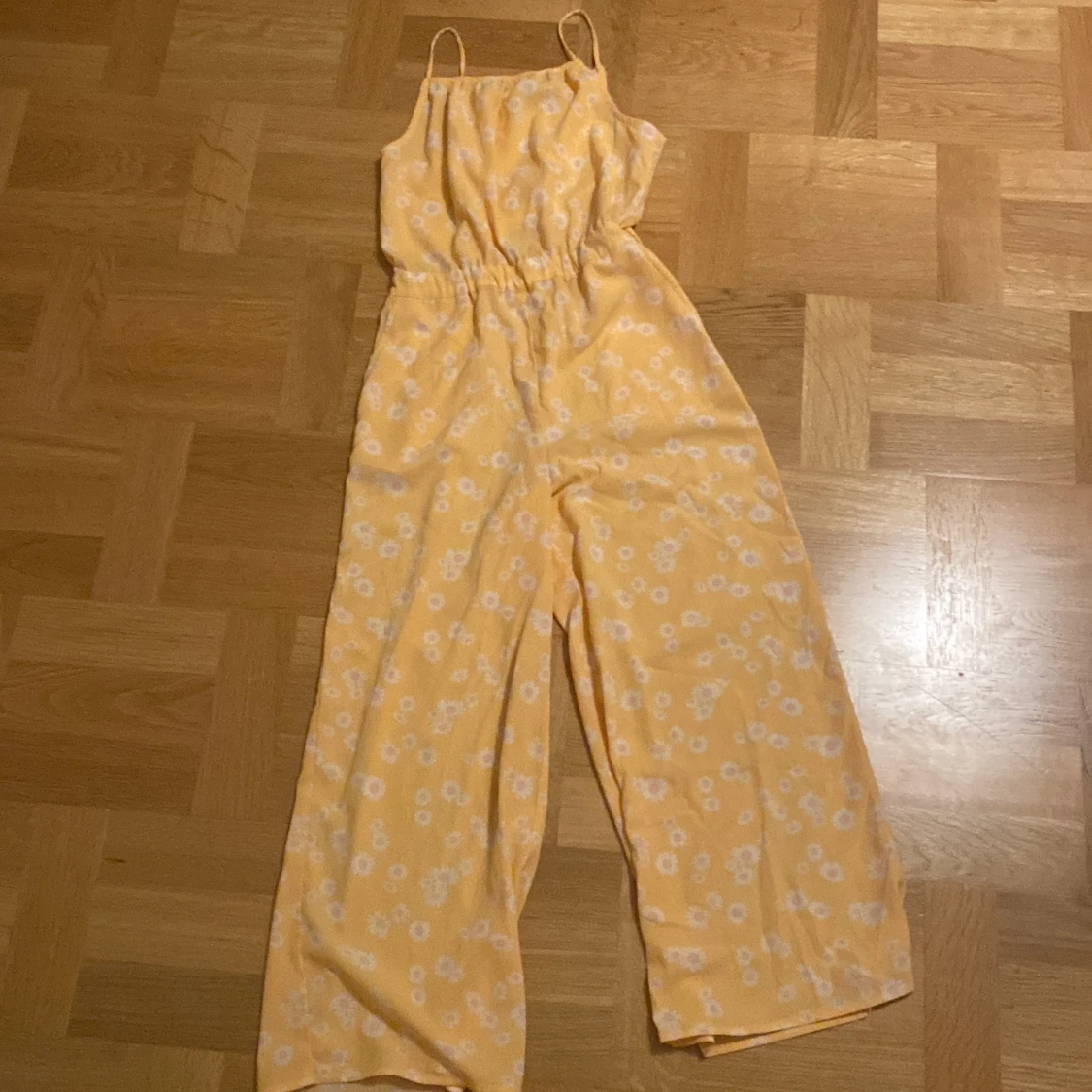 Säljer en söt gul jumpsuit från H&M med vita blommor. Den har smala axelband och en elastisk midja för en bekväm passform. Perfekt för soliga dagar! 🌼super fin och är i bra skick. Inga fläckar. Inga hål.