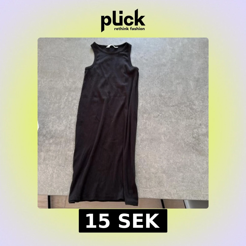 En svart, ärmlös ribbad klänning från H&M i stretchigt material. Modellen är enkel och skön med rund halsringning och rak passform, perfekt för en clean och stilren look. Klänningen är en kortklänning och passar dig som gillar minimalistisk stil. Perfekt till dig som drar till stranden och bara vill ha något över.