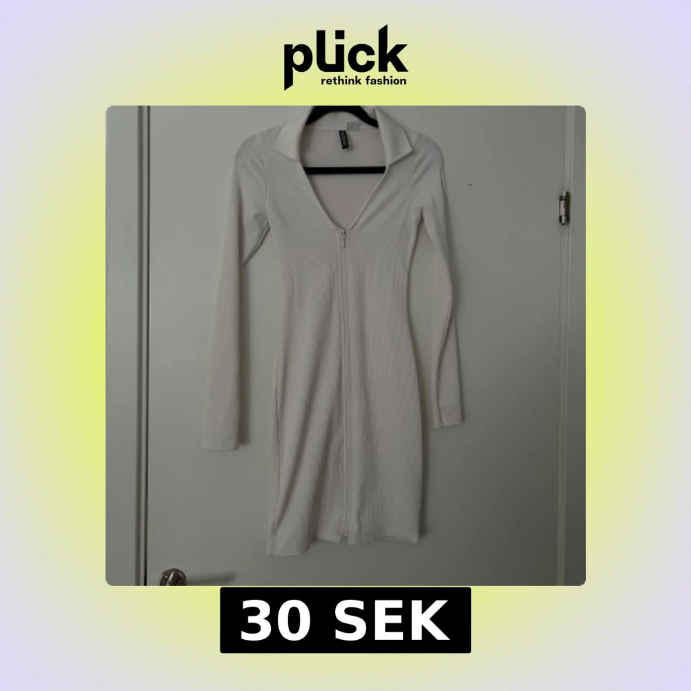 Säljer en vit ribbad klänning med lång ärm och djup v-ringning. Klänningen har en dragkedja framtill och en bred krage som ger en cool look. Perfekt för dig som gillar stilrena plagg med lite edge.