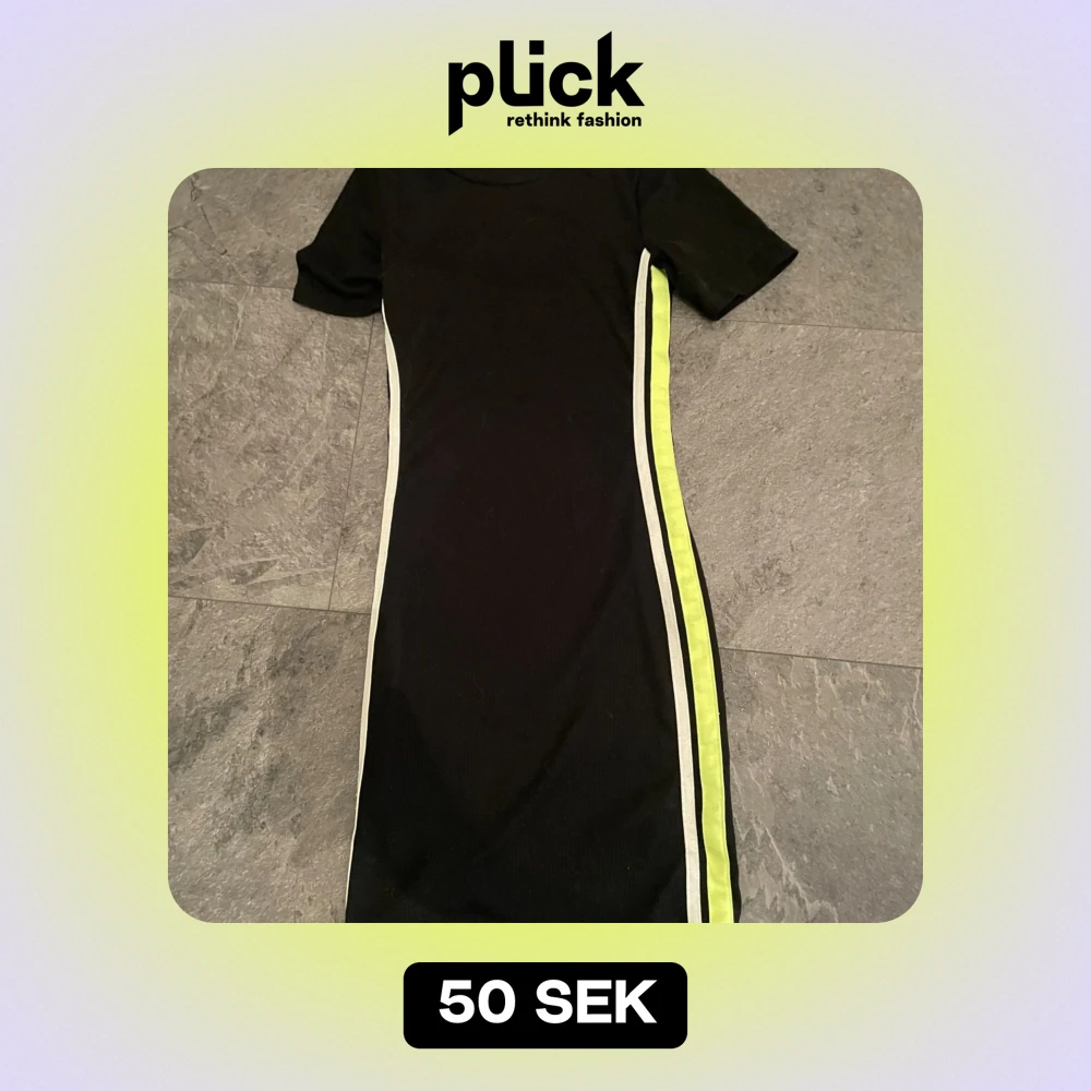 Snygg svart klänning med korta ärmar och coola neongula ränder längs sidorna. Perfekt för en sportig look eller en avslappnad dag ute. Klänningen är i ett mjukt och bekvämt material som gör den skön att bära hela dagen.