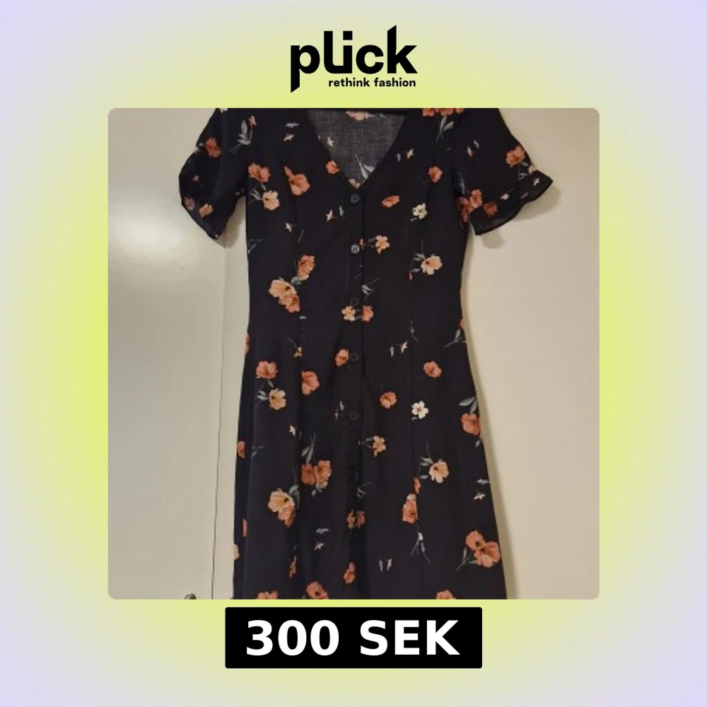 Supersöt svart kortklänning med rosa och vita blommor, v-ringning och knappar framtill. Klänningen har korta ärmar med liten volangkant och en lätt utställd passform. Perfekt för sommarens alla tillfällen!
