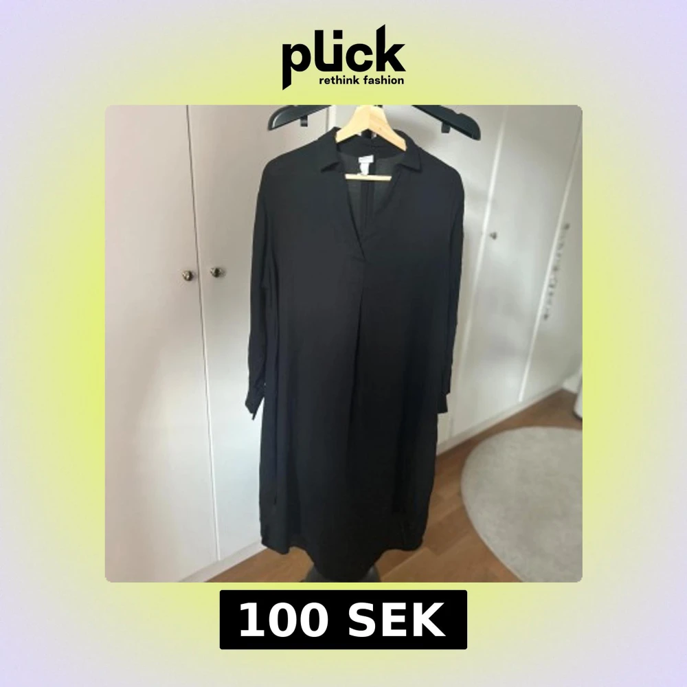 En svart, enkel och stilren skjortklänning från H&M med v-ringning och krage. Klänningen har lång ärm och en lös passform som ger en avslappnad vibe. Perfekt för dig som gillar minimalistisk stil.