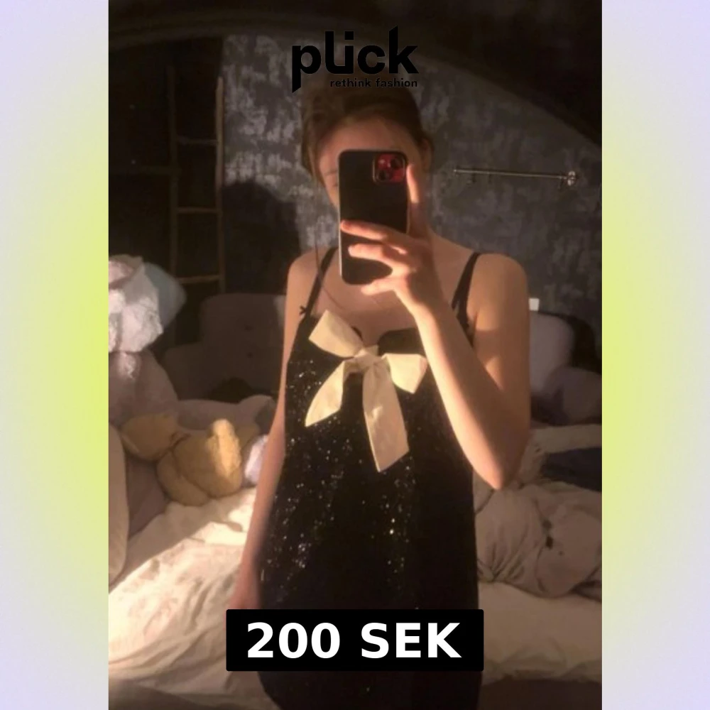 Supersöt svart glittrig kortklänning med smala axelband och stor vit rosett framtill. Klänningen har en rak passform och är perfekt för dig som vill sticka ut. Materialet är glittrigt och skimrar snyggt i ljuset. Ingen synlig logga eller märke. Storlek S, jag är 160.