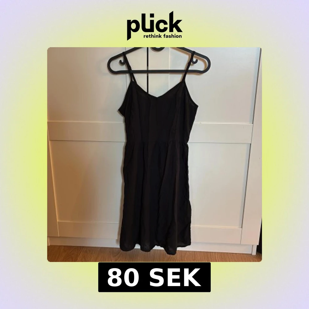 En svart, enkel och luftig kortklänning med smala axelband och v-ringad hals.