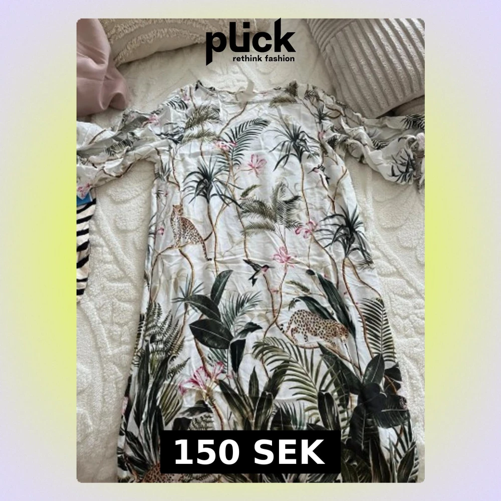 Säljer en vit långklänning från H&M med tropiskt blommönster och leoparddetaljer. Klänningen har lång ärm och är tillverkad i ett lätt, mjukt material som känns skönt mot huden. Perfekt för dig som gillar färgstarka prints och naturinspirerade plagg.