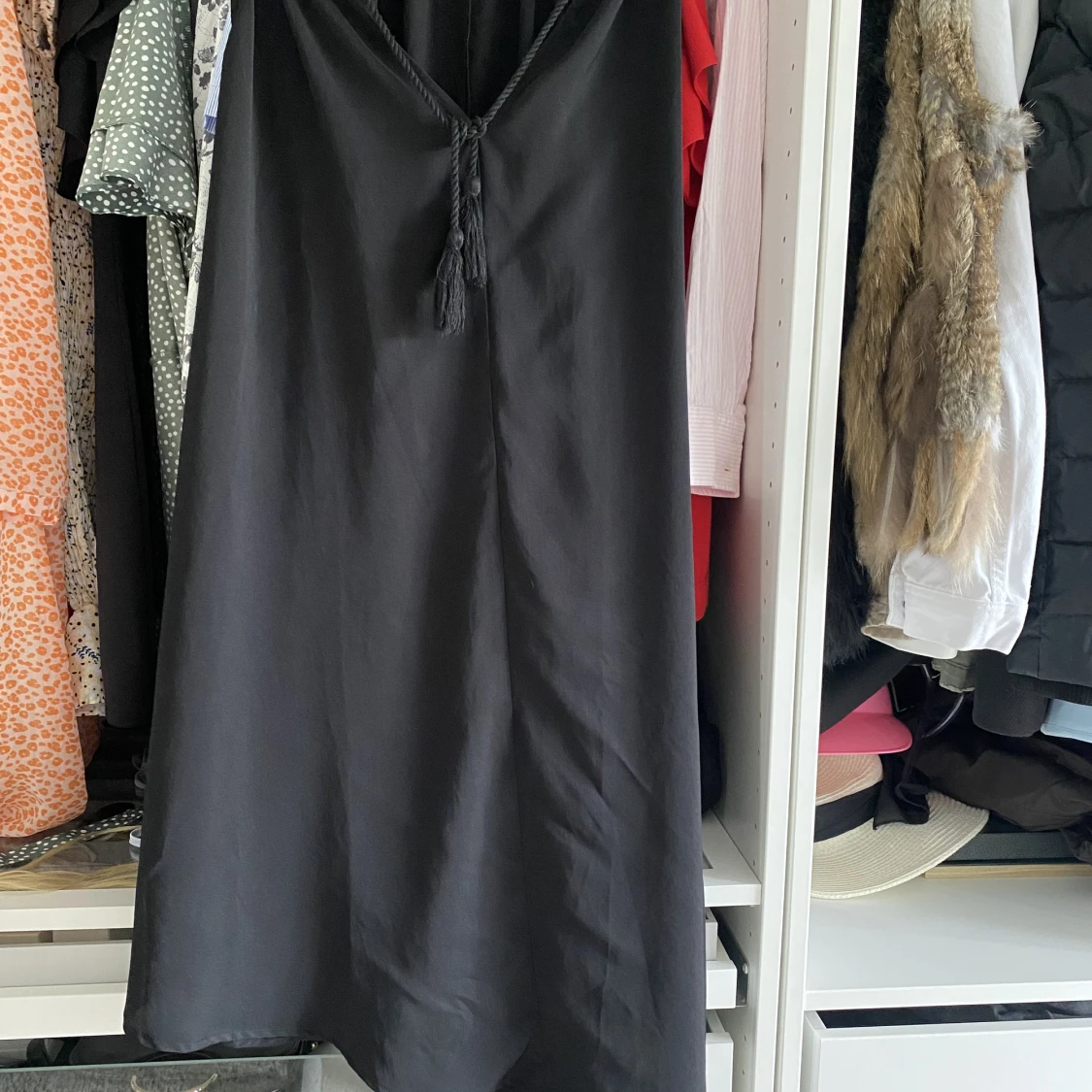 En svart Midi-klänning med lite bohemisk stil. Det följer även med ett band i midjan. Klänningen är snedskuren. Fint skick!