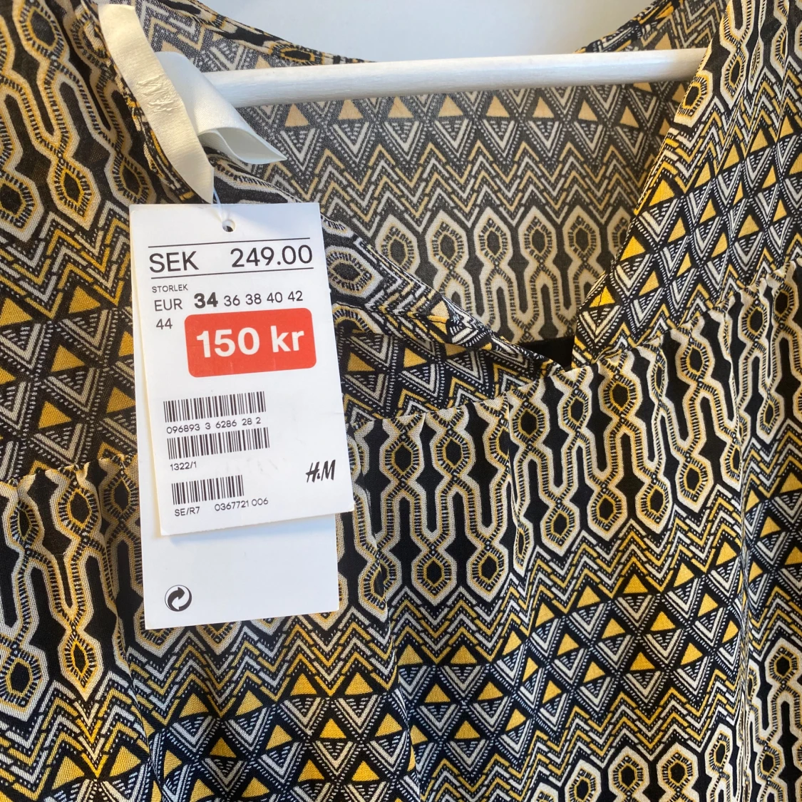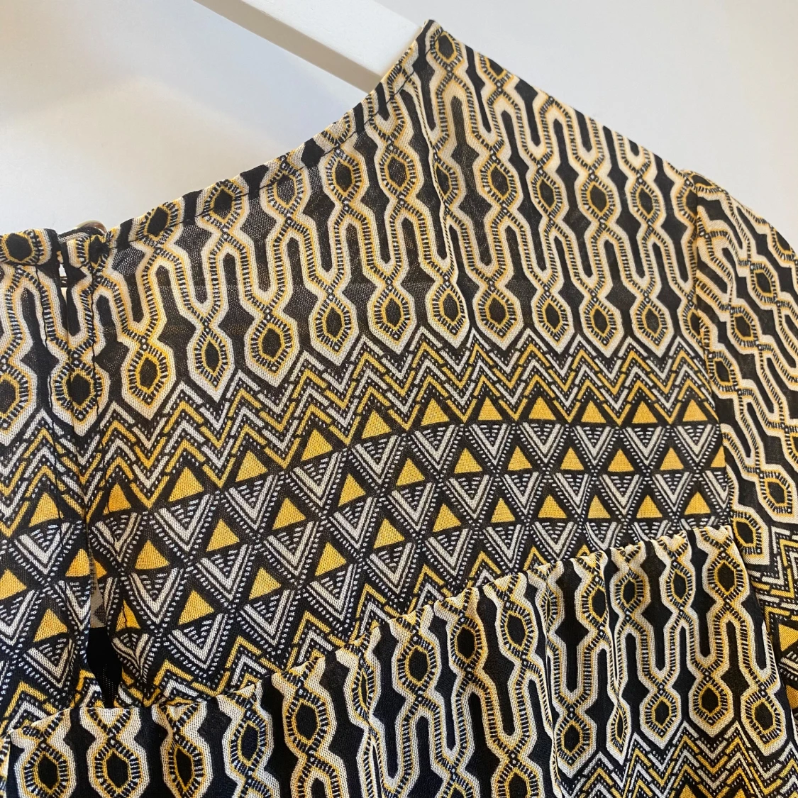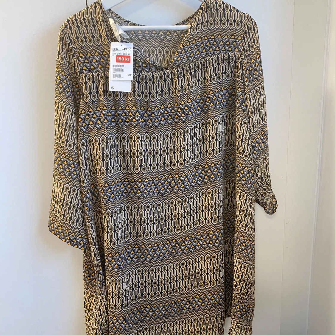Klänning från H&M med grafiskt mönster i svart, gult och beige. Klänningen har trekvartsärm och en lös passform. Materialet är lätt och känns skönt mot huden, perfekt för dig som gillar unika prints och bekväma plagg. Har även ett tunnt svart innertyg, se sista bilden. Går att använda som tunika eller kort klänning beroende på storlek.