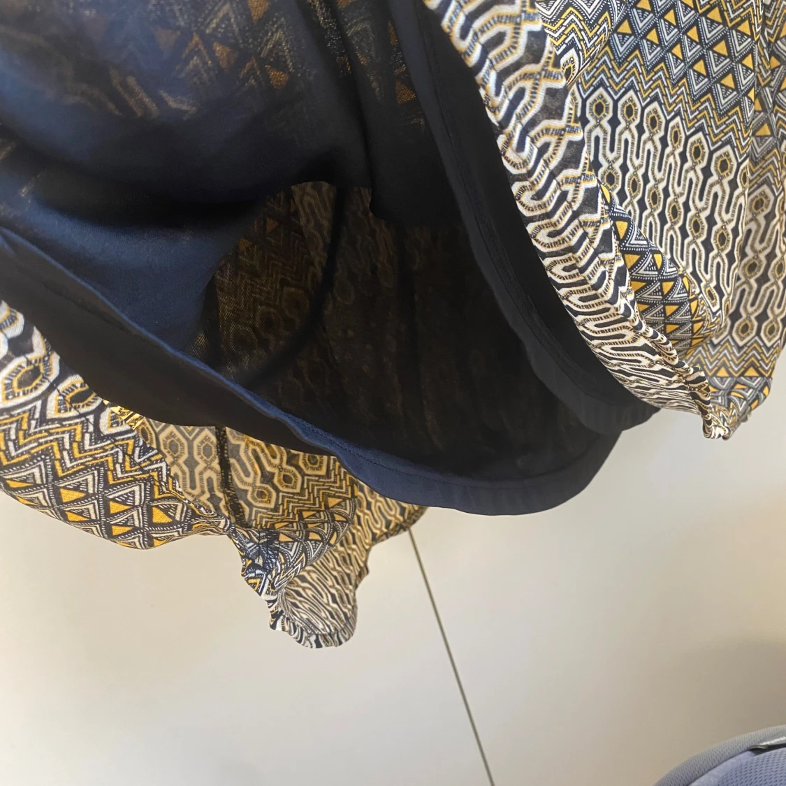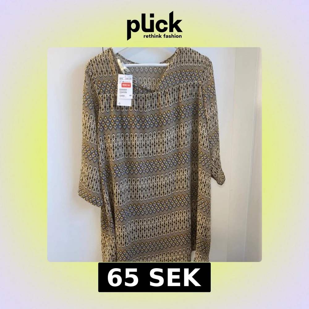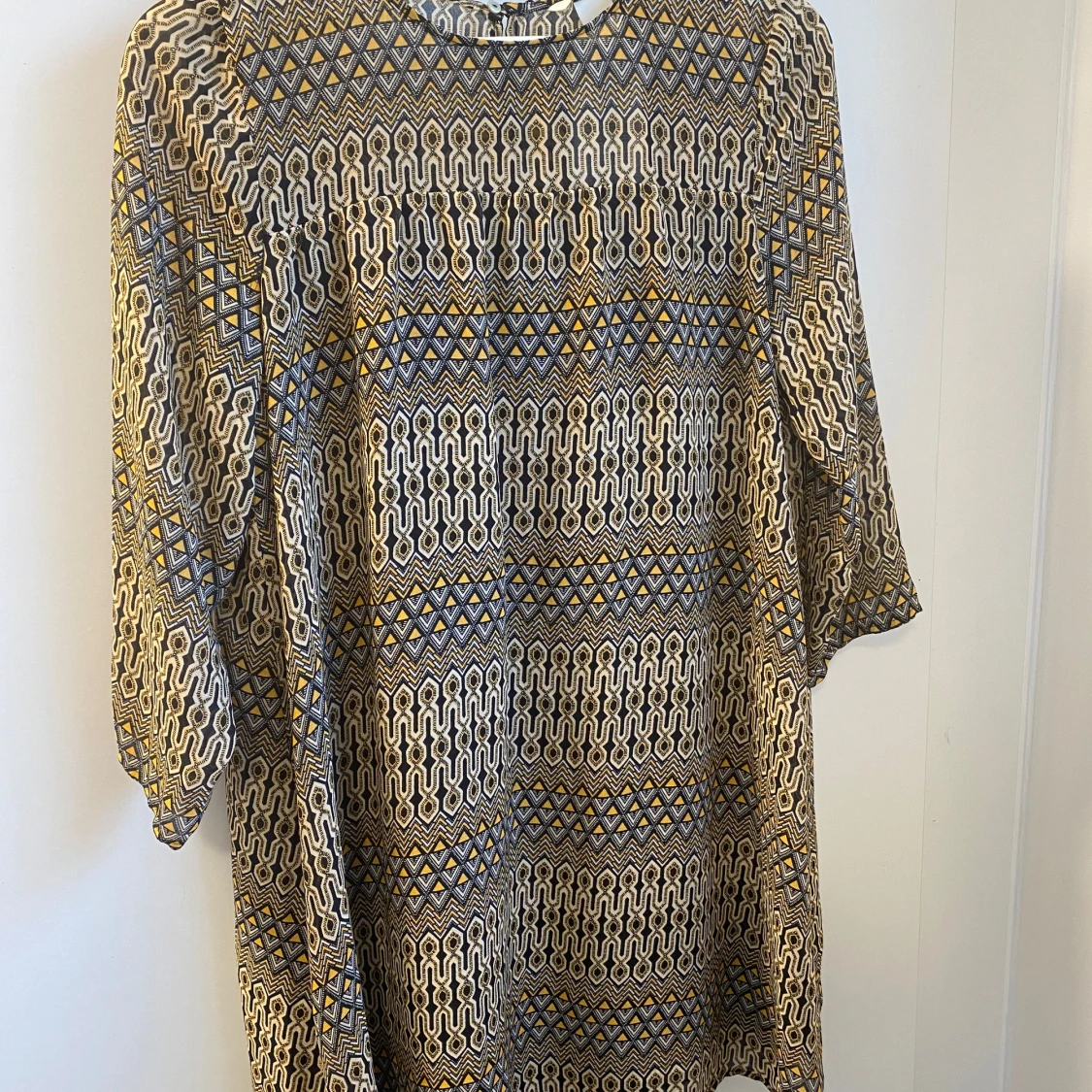 Klänning från H&M med grafiskt mönster i svart, gult och beige. Klänningen har trekvartsärm och en lös passform. Materialet är lätt och känns skönt mot huden, perfekt för dig som gillar unika prints och bekväma plagg. Har även ett tunnt svart innertyg, se sista bilden. Går att använda som tunika eller kort klänning beroende på storlek.