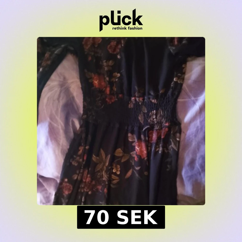 Säljer en långklänning med mörk botten och blommigt mönster i rött, orange och beige. Klänningen har långa ärmar med resår vid handlederna, markerad midja med smock och volangdetaljer. Perfekt för dig som gillar romantisk och bohemisk stil.