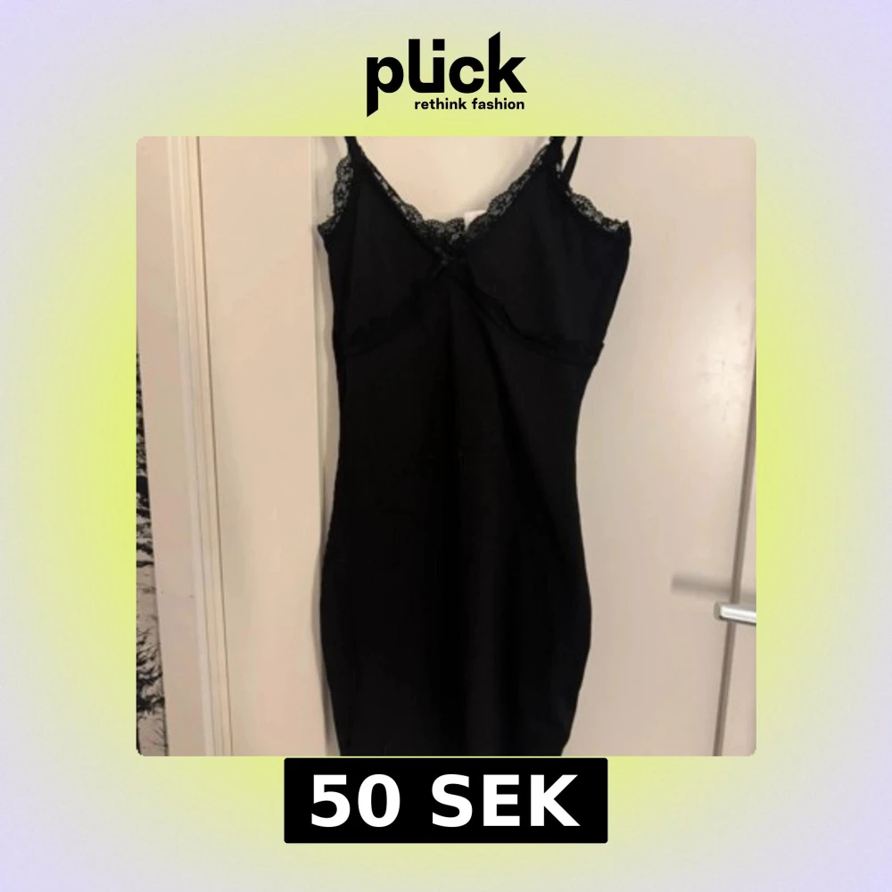Svart ribbad klänning med smala axelband och spets längs urringningen. Klänningen har en figurnära passform och är perfekt för dig som gillar en enkel men ändå söt stil. Axelbandsmodellen ger en feminin touch.
