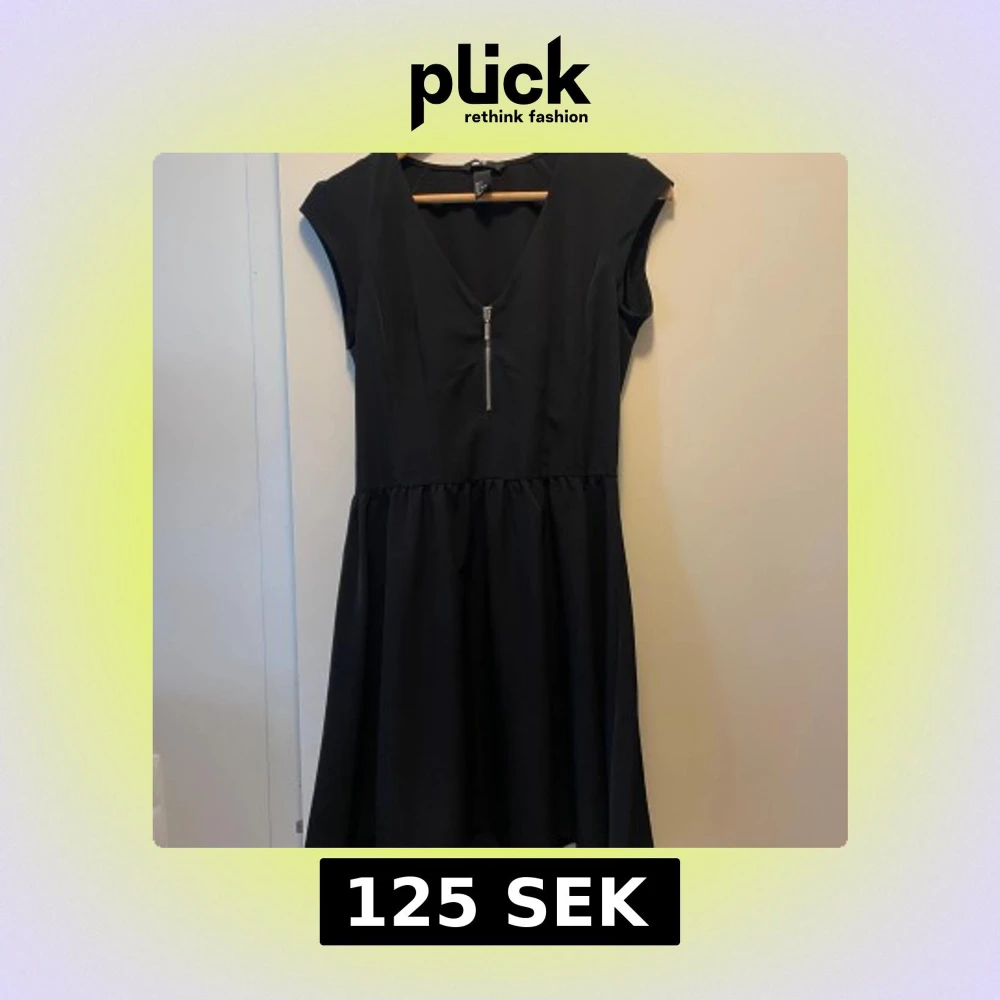 Svart kortklänning från H&M med v-ringning och en snygg dragkedjedetalj framtill. Klänningen har korta ärmar och markerad midja med lätt utställd kjol.