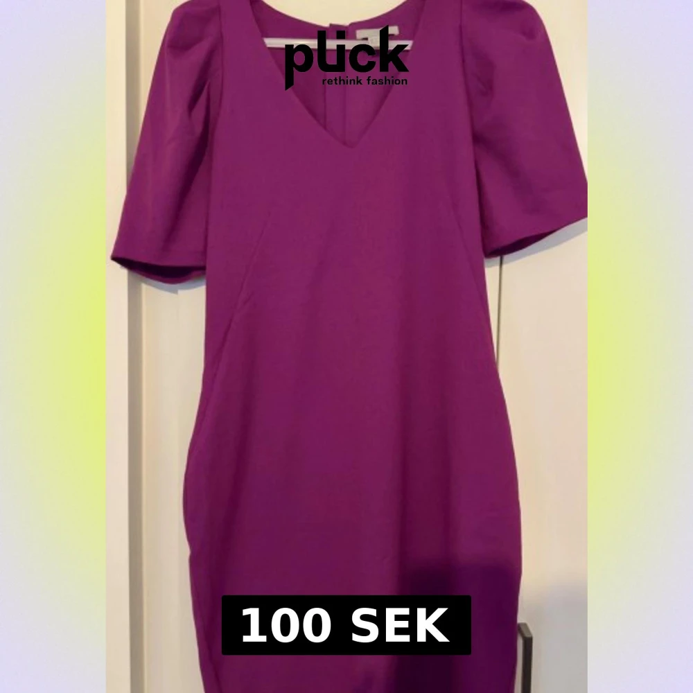 Snygg lila klänning från H&M i storlek 36. Klänningen har v-ringning, korta puffärmar och en markerad dragkedja i guld baktill. Materialet är mjukt och följsamt, perfekt för dig som vill ha en enkel men stilren look.