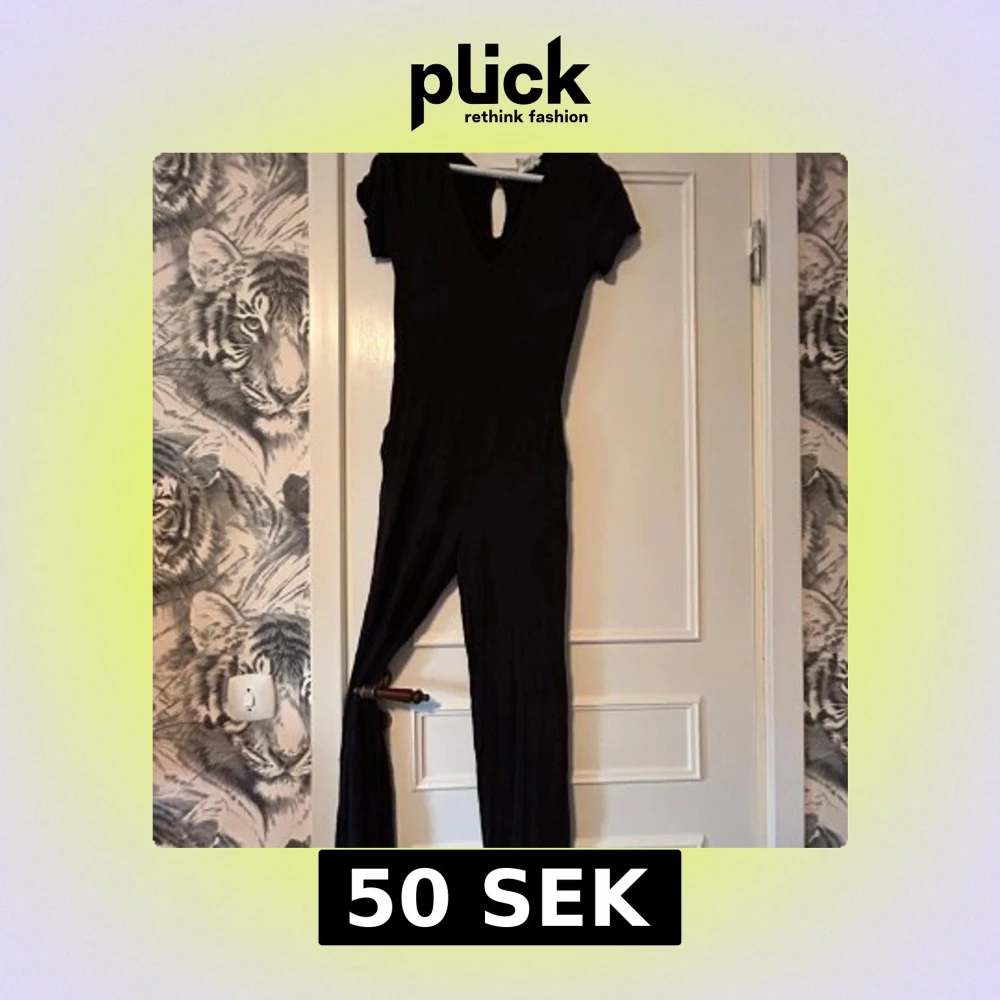 En svart jumpsuit med korta ärmar och v-ringning framtill. Jumpsuiten har resår i midjan för en bekväm och formande passform. Enkel och stilren design som passar perfekt när du vill känna dig extra snygg.