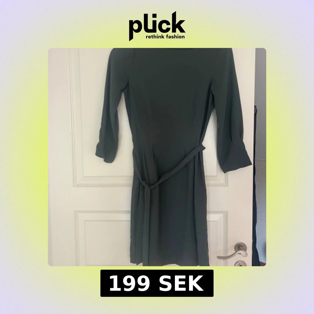 En stilren mörkgrön klänning med trekvartsärm och matchande bälte i midjan. Klänningen har en enkel, rak passform och är tillverkad i ett mjukt, lätt material som ger ett snyggt fall. Perfekt för dig som gillar minimalistisk stil. Aldrig använd.
