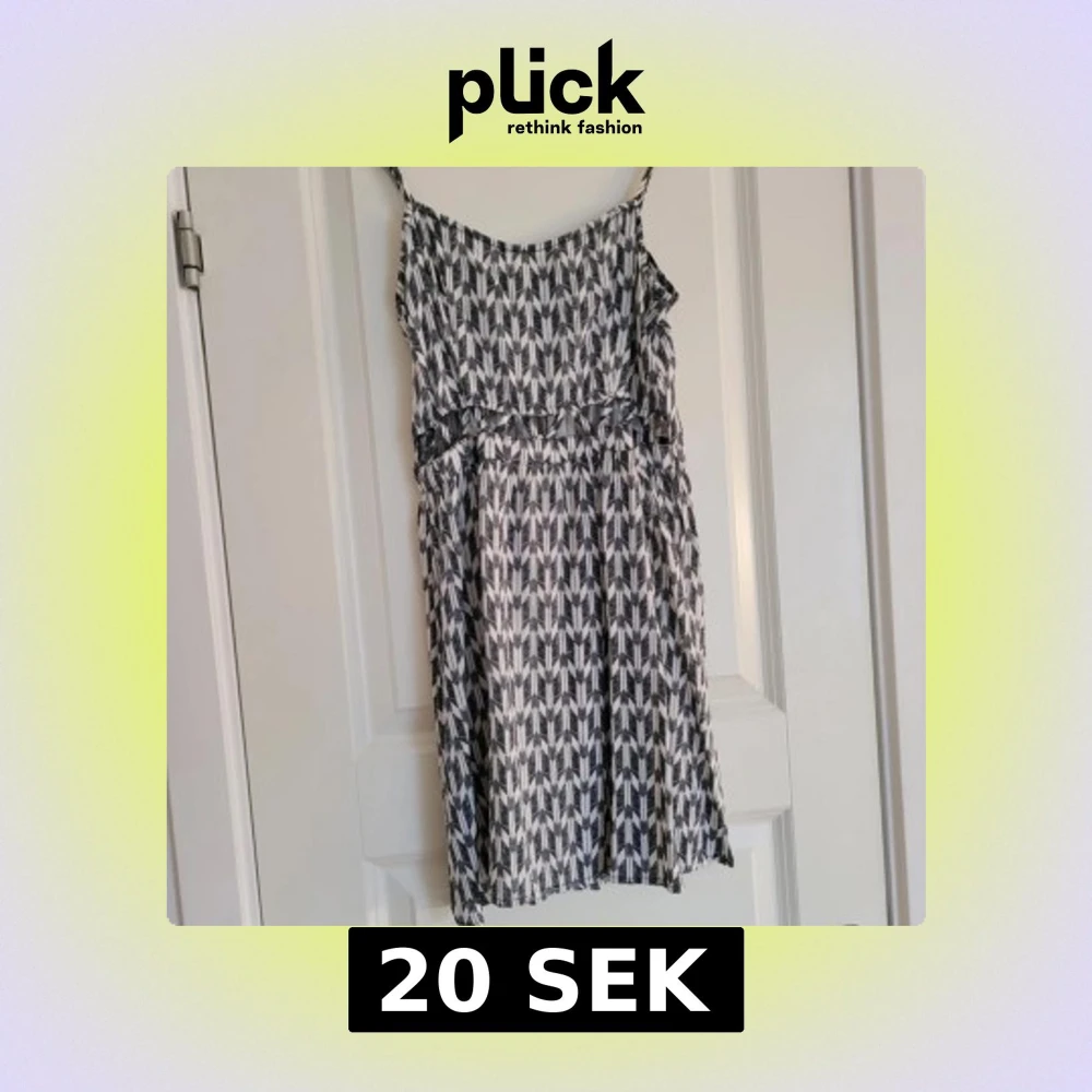 Säljer en snygg klänning med svartvitt geometriskt mönster och smala axelband. Klänningen har en unik detalj med öppna partier i midjan och en luftig passform. Perfekt för varma dagar!