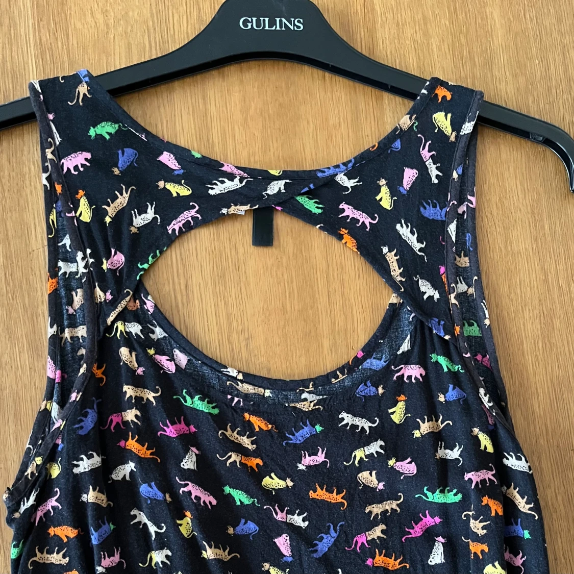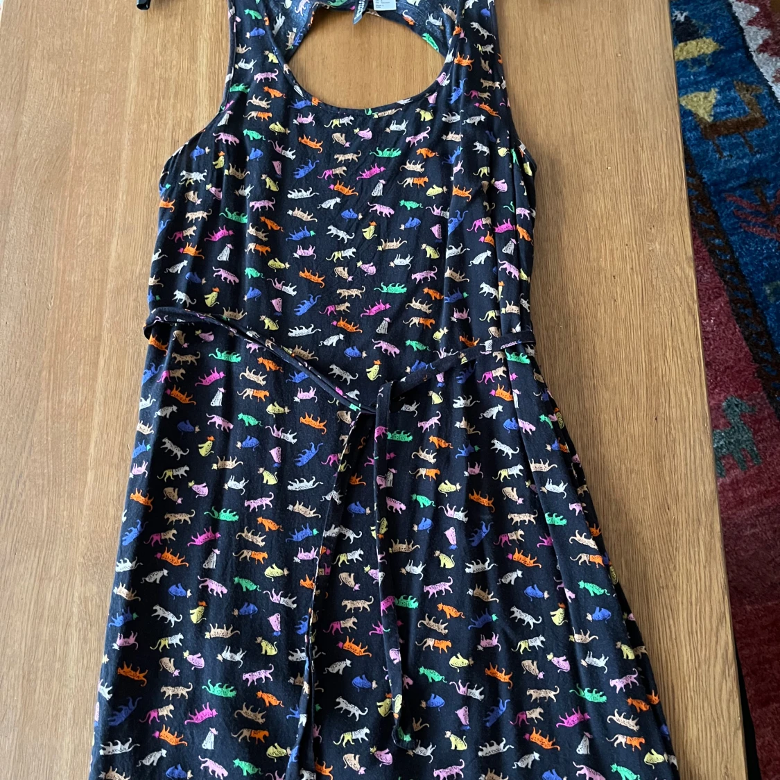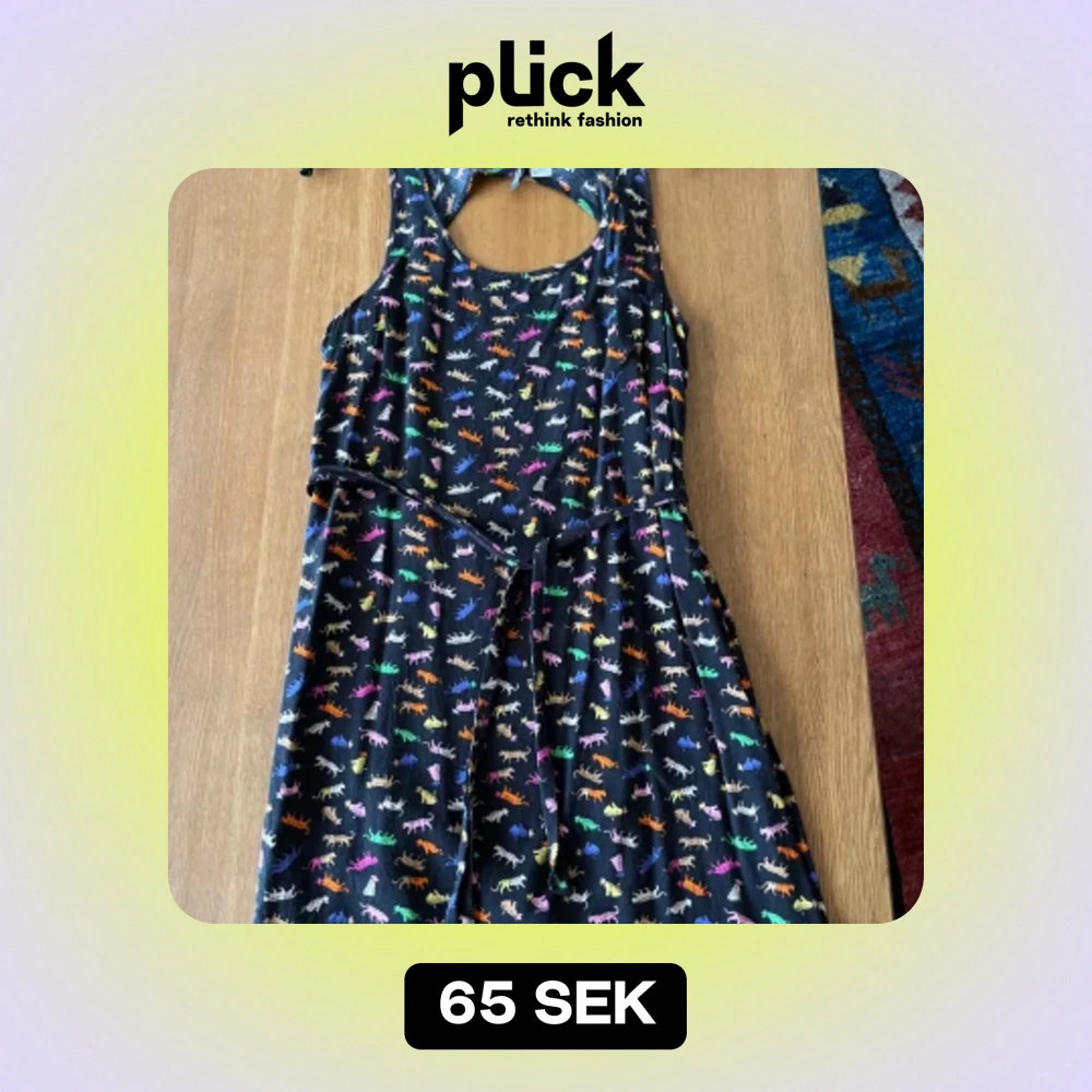 Svart klänning med mönster/kattdjur i många färger. Knytskärp och rundad öppning upptill i ryggen. HM, St. 36. Bomull, viskos