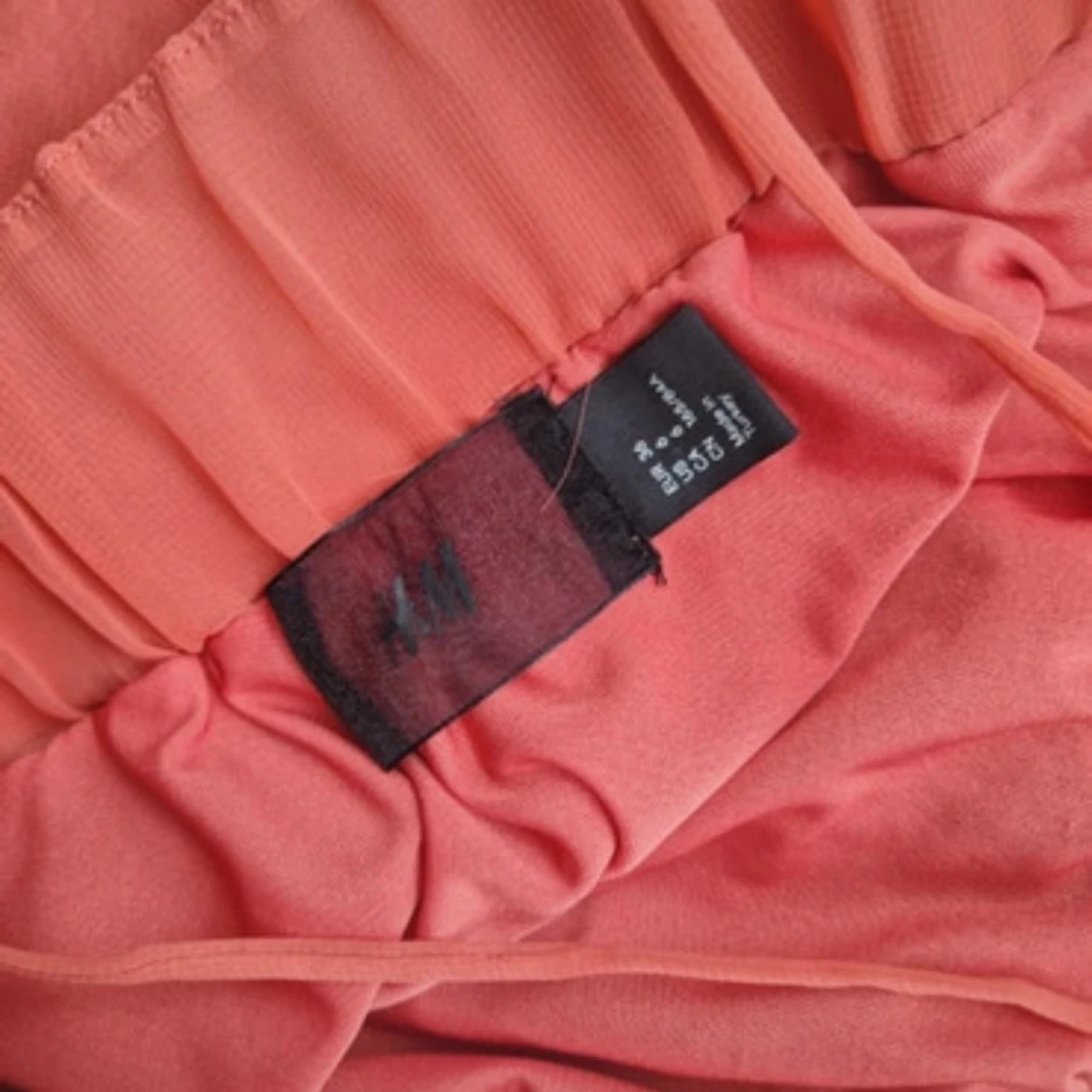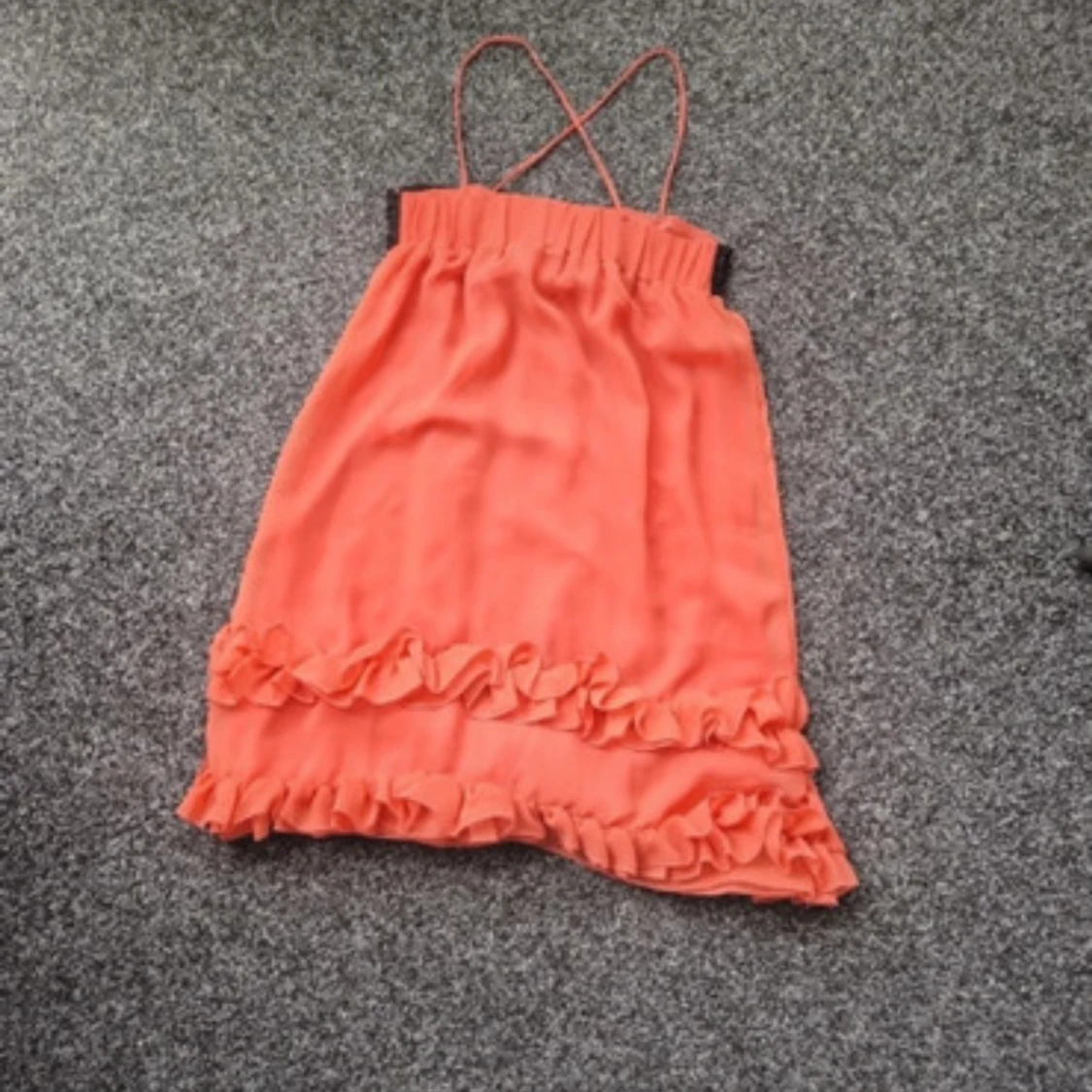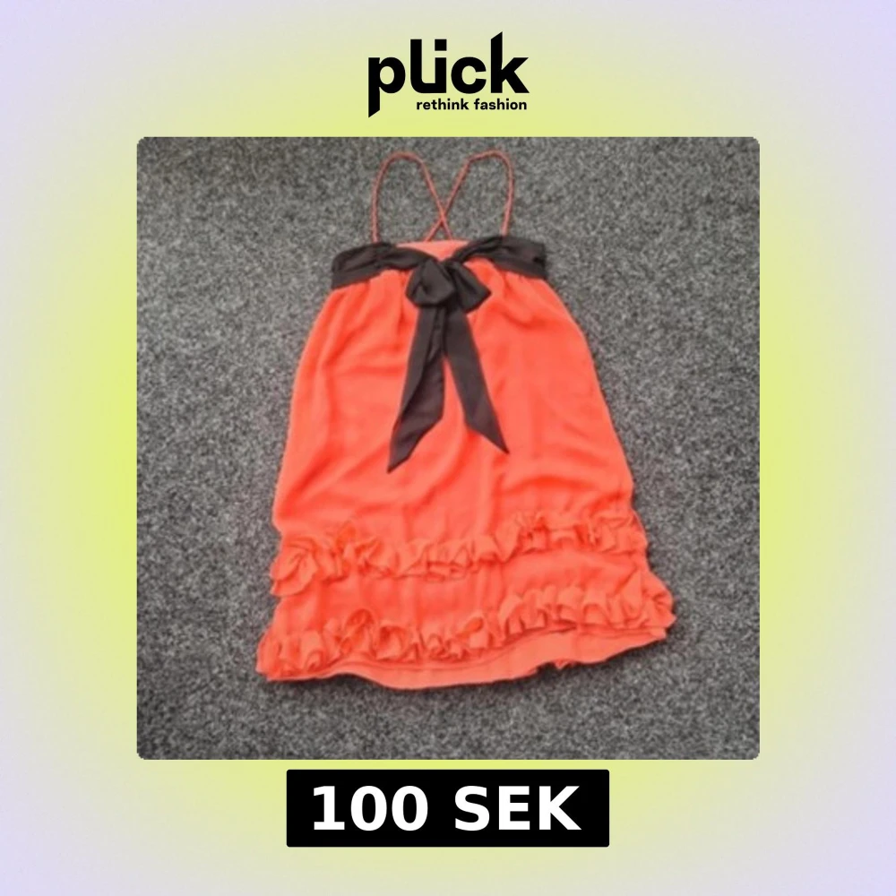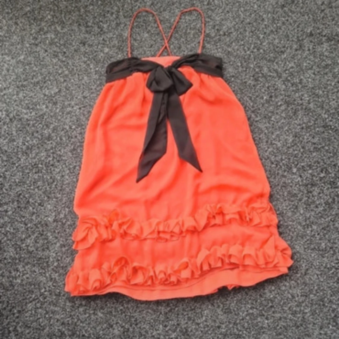 Supersöt korallrosa kort klänning från H&M med tunna axelband, volangdetaljer nertill och en stor svart rosett framtill. Klänningen har en luftig passform och är gjord i polyester, perfekt för varma dagar.