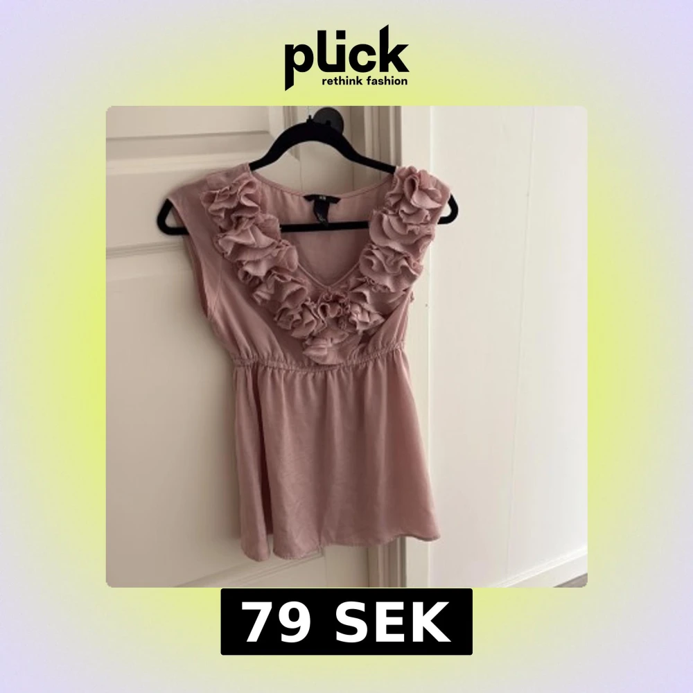 Säljer en ljusrosa blus från H&M i storlek 36. Blusen har v-ringning och ärmlös design med stora volangdetaljer runt halsen. Materialet är mjukt och har ett fint fall, perfekt för dig som gillar romantisk stil.