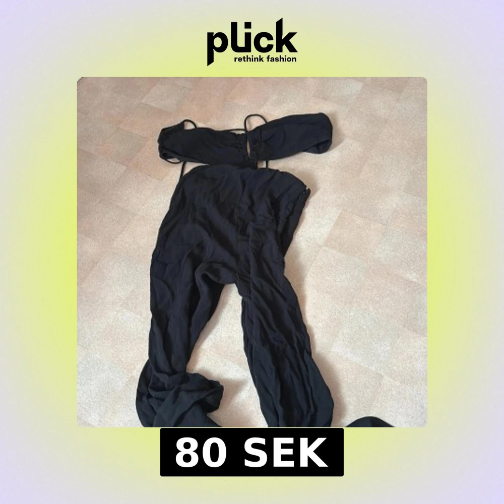 Supersnygg svart jumpsuit från H&M med offshoulder och smala axelband. Vida ben och rynkade detaljer upptill ger en trendig look. Perfekt för dig som vill sticka ut med en cool och stilren outfit.