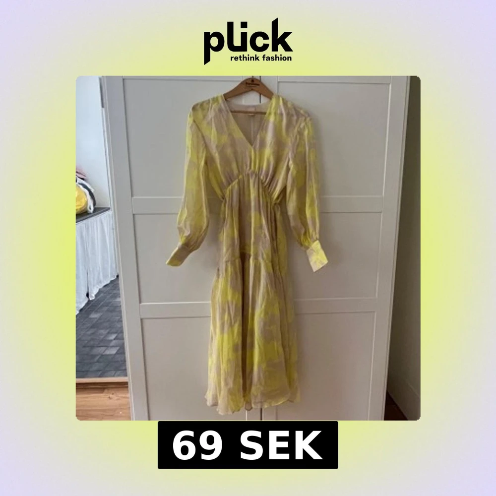 Superfin långklänning från H&M i gul och beige med abstrakt mönster. Klänningen har v-ringning, långa puffärmar med bred manschett och markerad midja med rynk. Luftigt material, perfekt för varma dagar.
