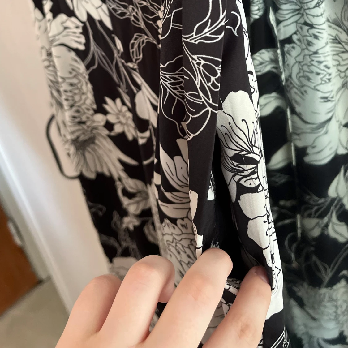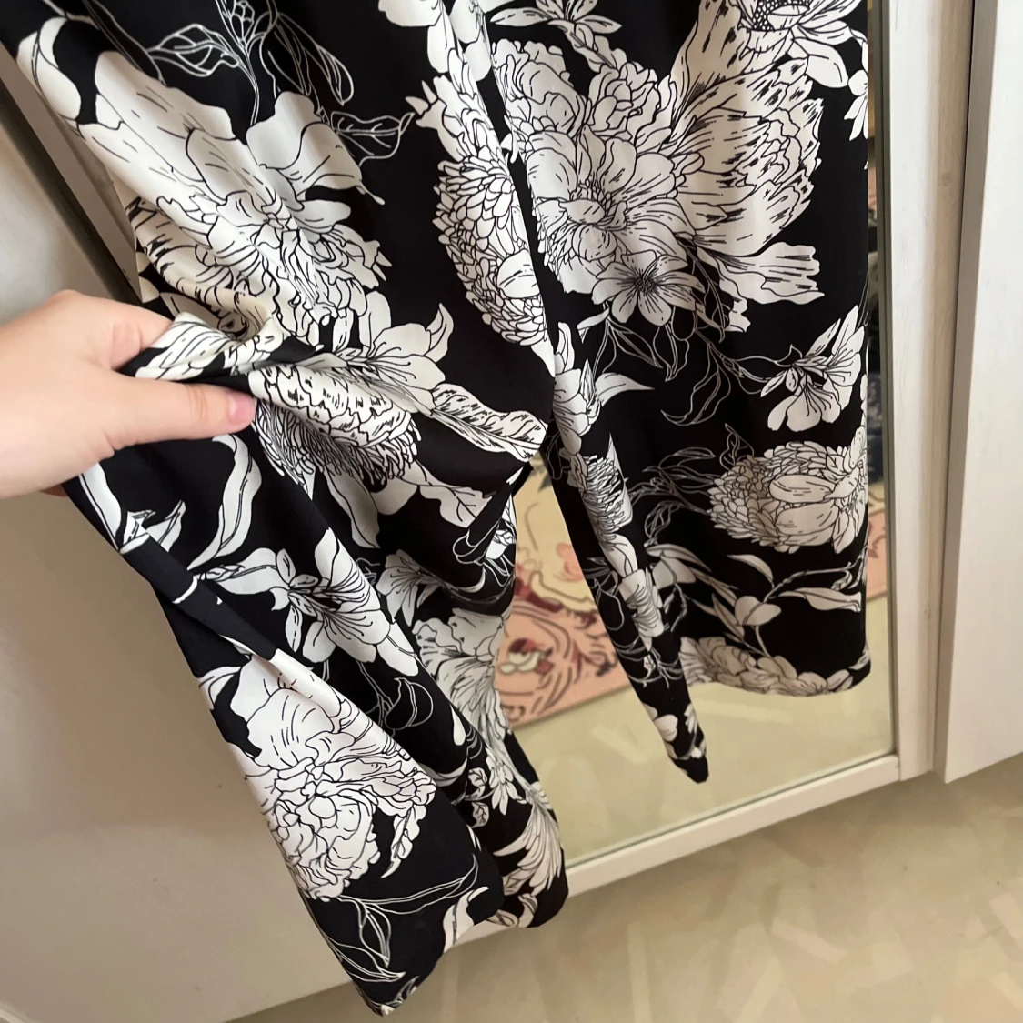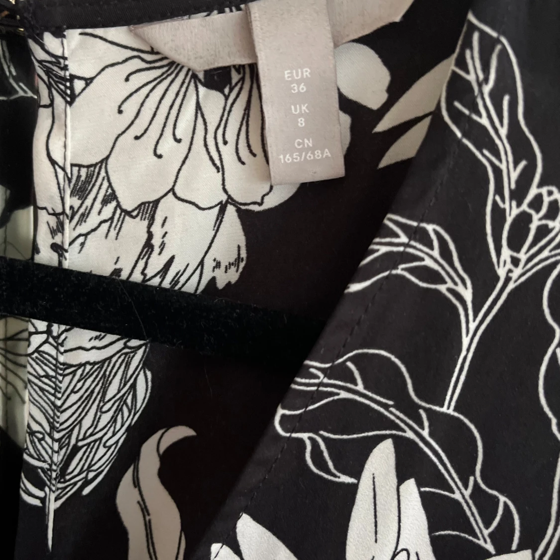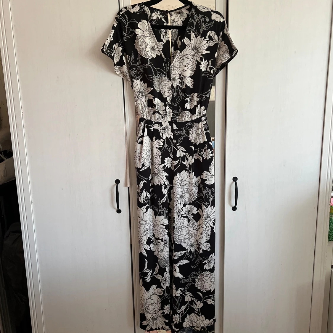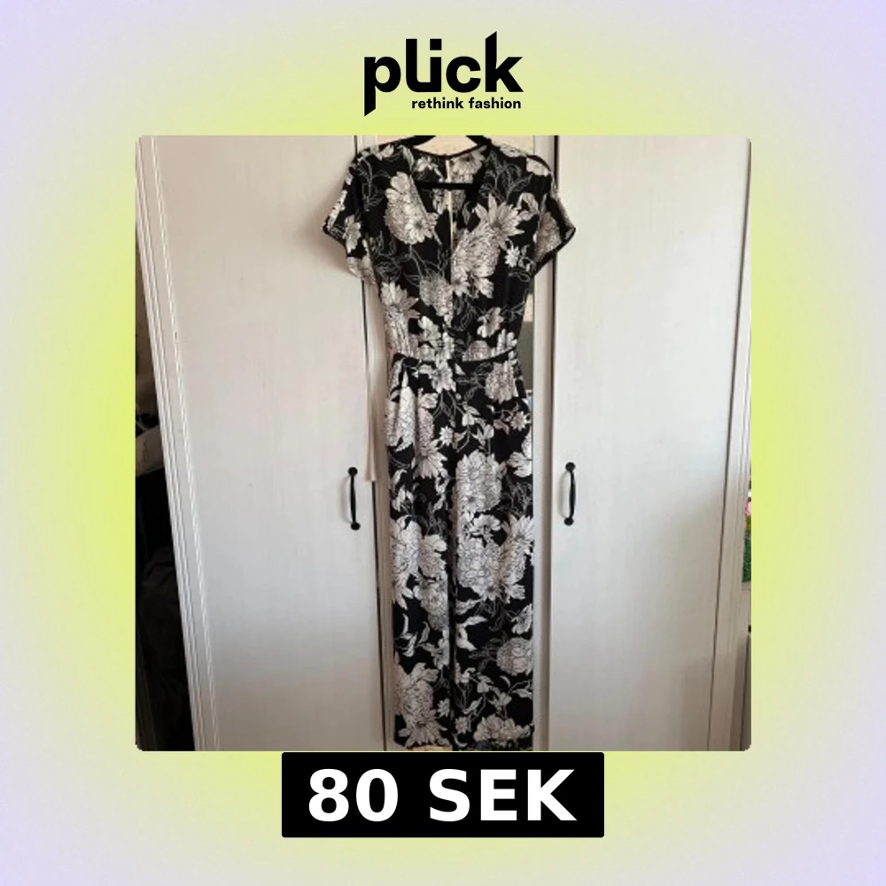 En svart byxdress med vita blommor i storlek 36 från H&M. Dressen har korta ärmar, v-ringning och vida ben samt knäppning baktill vid nacken. Fickor på sidorna samt tillhörande bälte som är avtagbart!💞