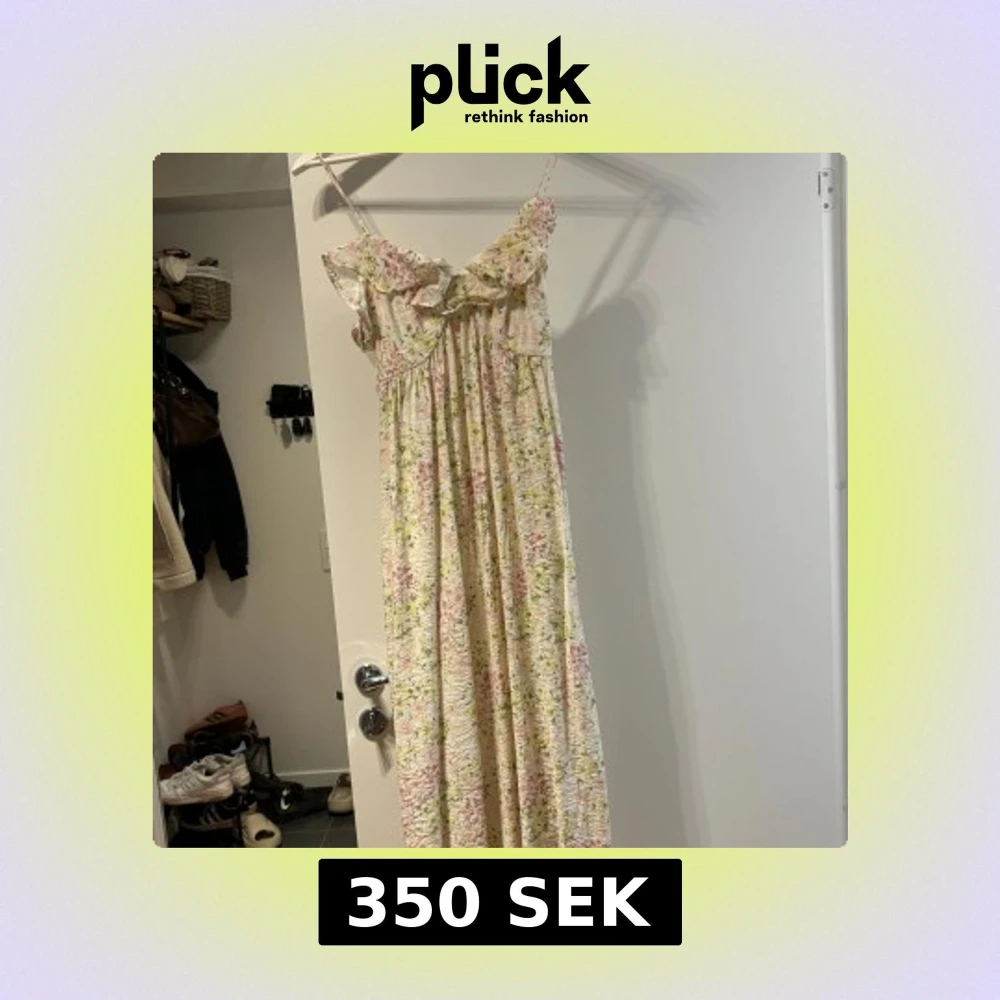 Säljer en romantisk långklänning med blommigt mönster i ljusa toner. Klänningen har smala axelband, volang upptill och en luftig passform som ger en skön känsla. Perfekt för varma dagar och somriga tillfällen.