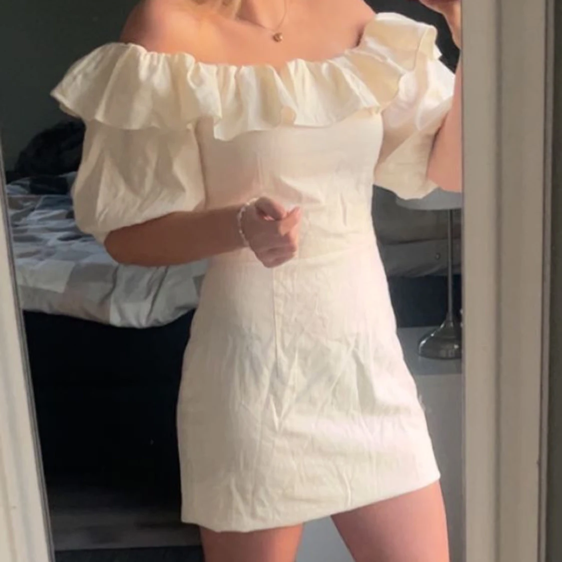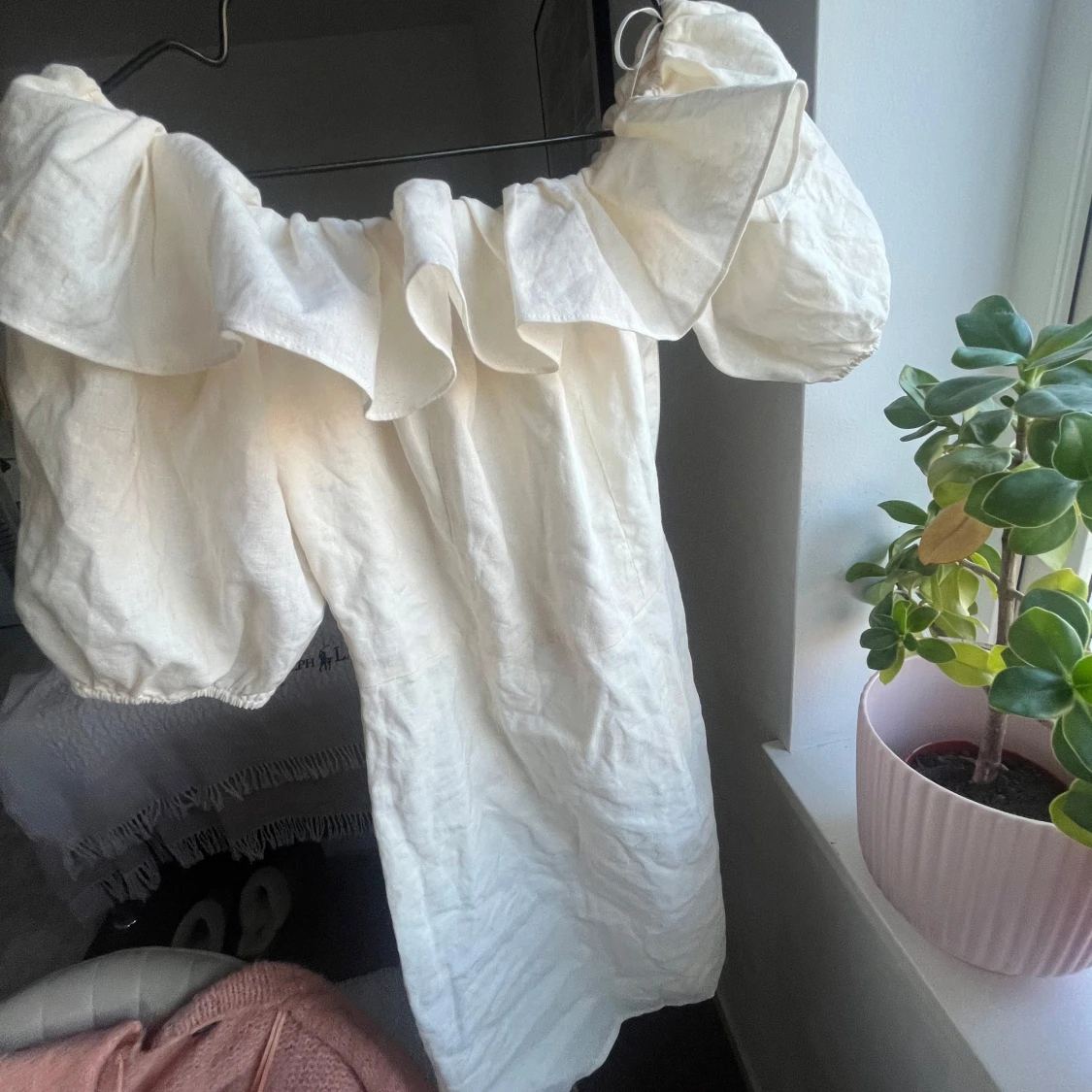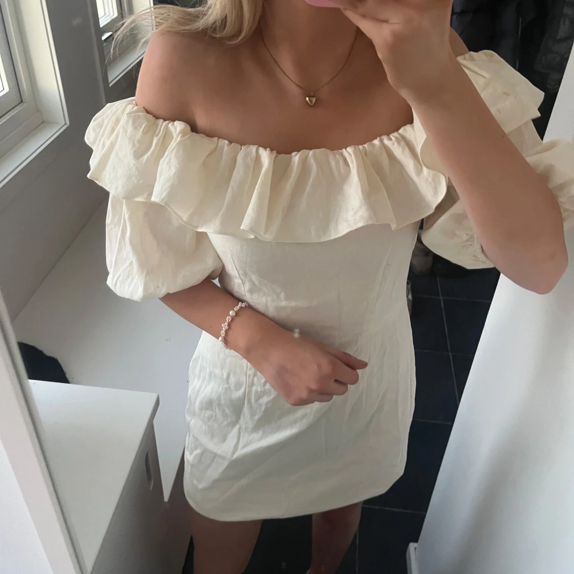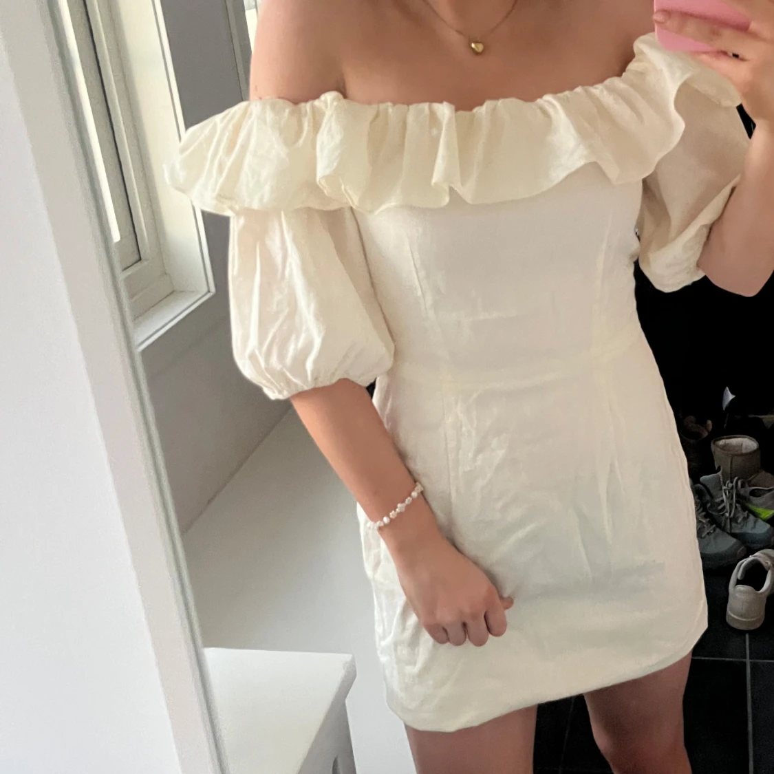 Jätte söt klänning från hm i en krämig vit färg som man båda kan ha off shoulder och på axlarna🥰 den är inte så kort som på bilderna, jag bara har vikt upp den.