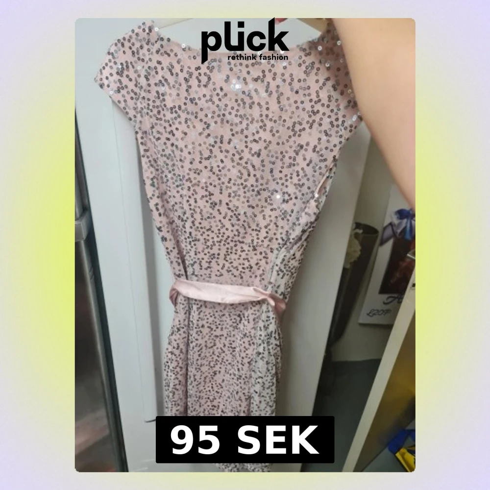Säljer en ljusrosa kortklänning från H&M, täckt med glittriga paljetter och ett matchande satinband som knyts i midjan. Klänningen har en rund halsringning och är ärmlös, perfekt för att sticka ut med extra bling.