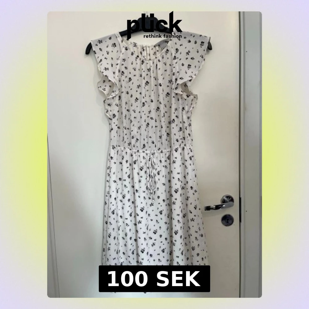 Söt vit klänning med små svarta blommor, volangdetaljer vid axlarna och knytband i midjan. Klänningen har en luftig passform och är ärmlös med rund halsringning. Perfekt för varma dagar och ger en romantisk vibe.