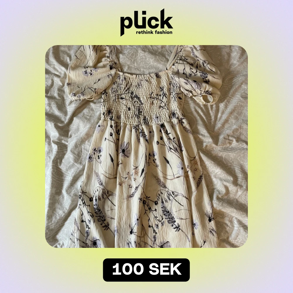 Superfin blommig klänning i ljus färg med puffiga kortärmar och smockdetaljer på överdelen. Perfekt för sommarens fester eller en mysig vårdag. Den har ett romantiskt mönster med blommor i mörka toner och en luftig passform.