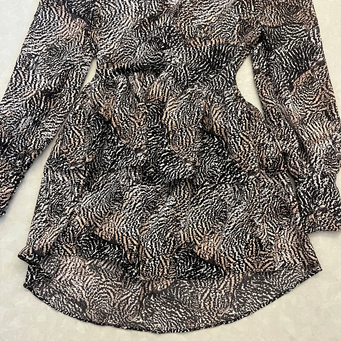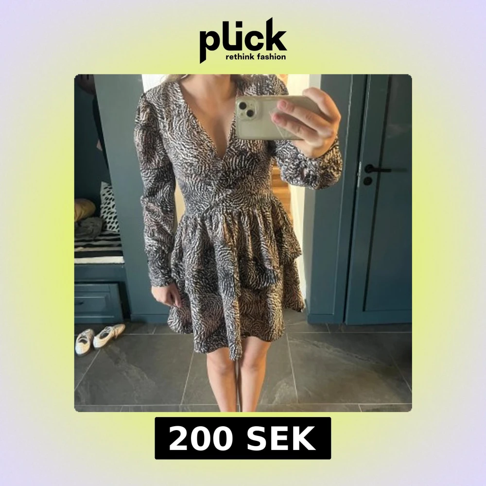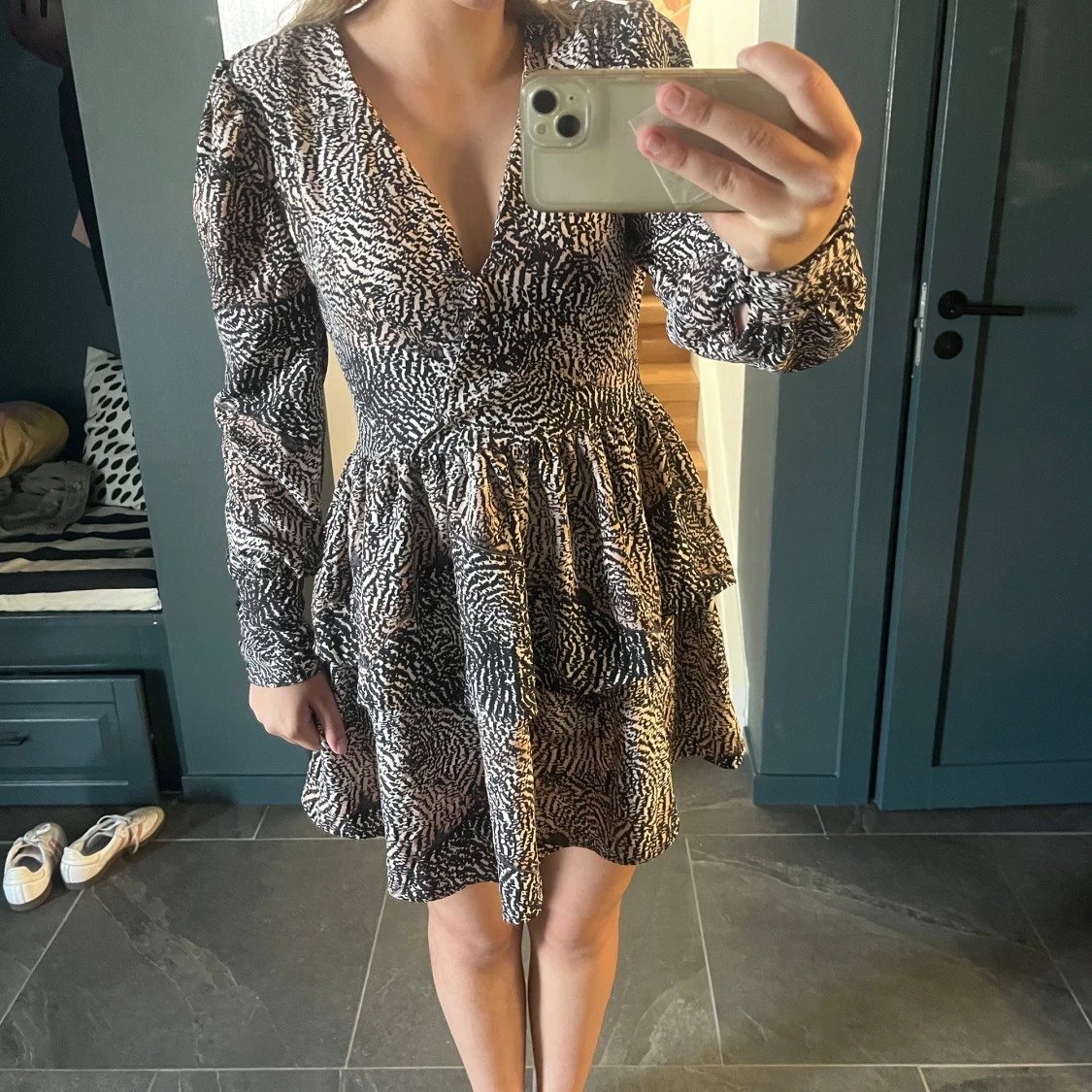 Supersnygg kort klänning med zebramönster i svart och beige. Klänningen har v-ringning, långa ärmar och markerad midja med volangig kjol. Perfekt för dig som vill sticka ut med ett djurmönster och gillar trendiga detaljer.
