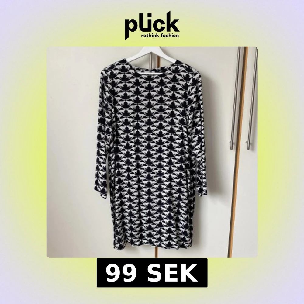 Cool svartvit klänning med ett kattmönster. Klänningen har långa ärmar och rak modell. Sval och mjuk i 100% viskos. Djup knäppning på ryggen med två knappar. Längd 92 cm mått runt höfterna 104 cm.
