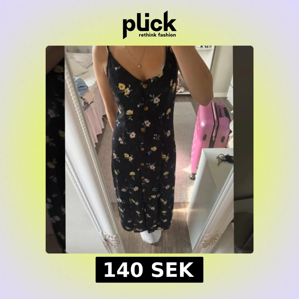 Supersöt svart långklänning från H&M med tunna axelband och knappar framtill. Klänningen har ett blommigt mönster i gult och rosa, v-ringad hals och en flowy passform. Perfekt för sommarens alla tillfällen!