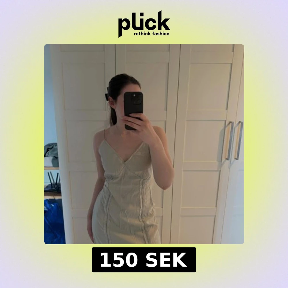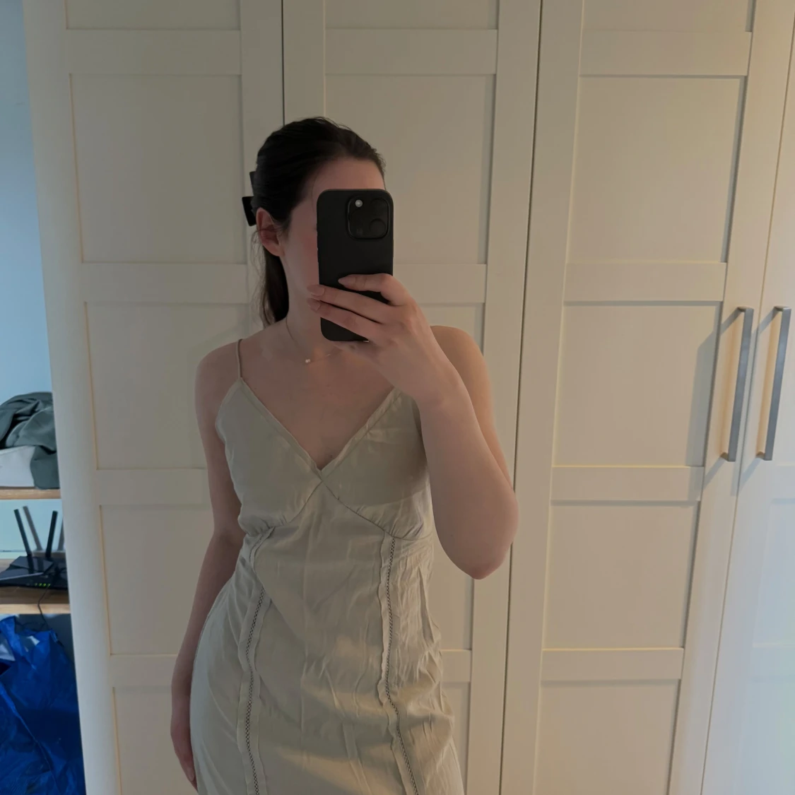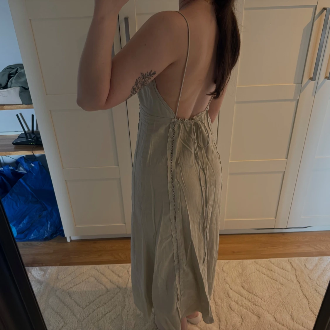 Säljer en långklänning med smala axelband och djup öppen rygg. Klänningen har v-ringad front och söta sömdetaljer längs sidorna. Perfekt för varma dagar och somriga vibes.