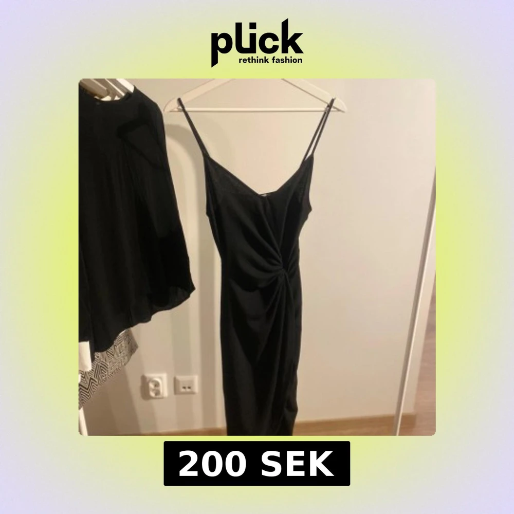 Elegant svart klänning från H&M med smala axelband och en stilren drapering framtill. Perfekt för en kväll ute eller en speciell tillställning. Klänningen har en figurnära passform som framhäver silhuetten. 36/38 i storlekens passform.