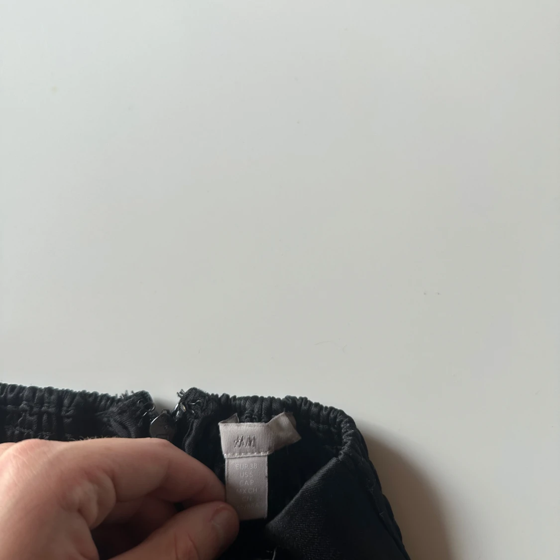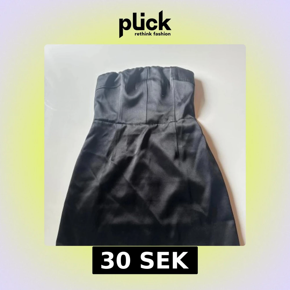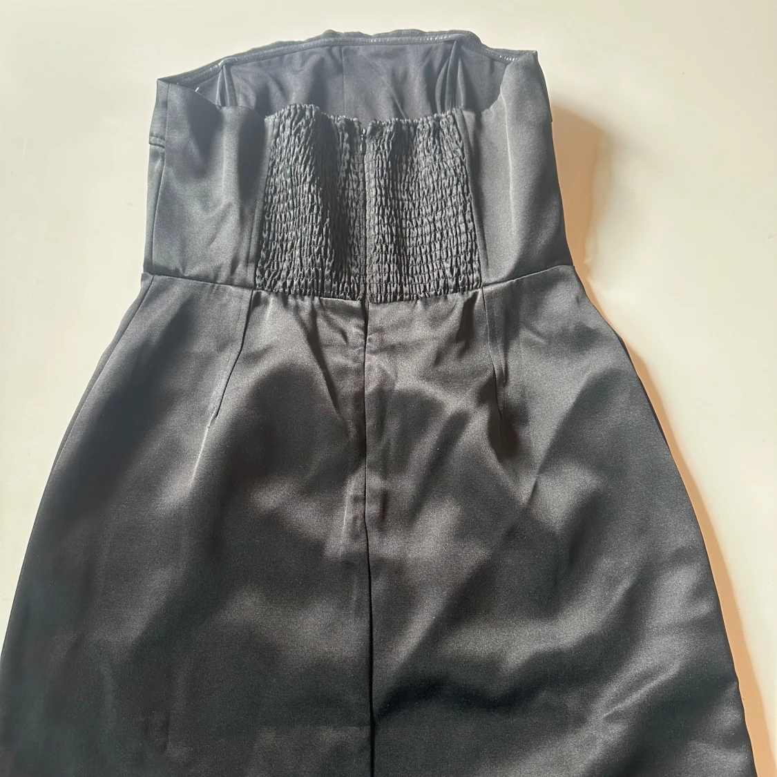 Snygg svart axelbandslös klänning från H&M med smockad rygg och slät framsida. Klänningen är kort och har en elegant, figurnära passform. Materialet är mjukt och har en lätt glansig yta som ger en lyxig känsla. Perfekt för dig som vill ha en stilren look.