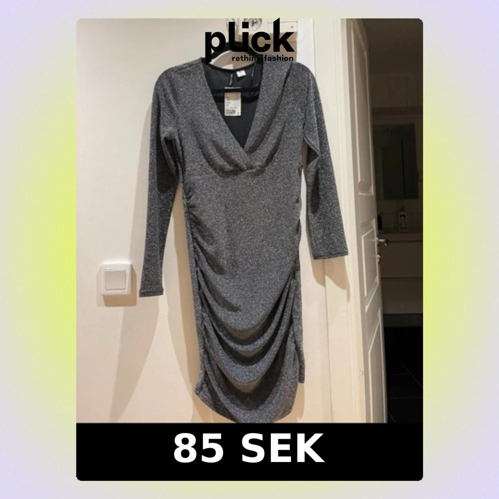 Snygg glittrig silverfärgad klänning från H&M med v-ringad hals, långa ärmar och draperad effekt framtill. Kort modell som sitter snyggt på kroppen och passar perfekt när du vill sticka ut lite extra.