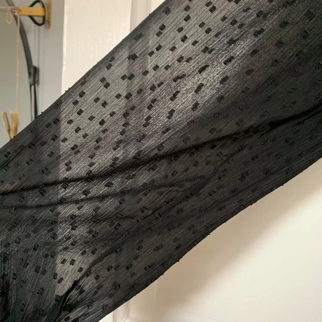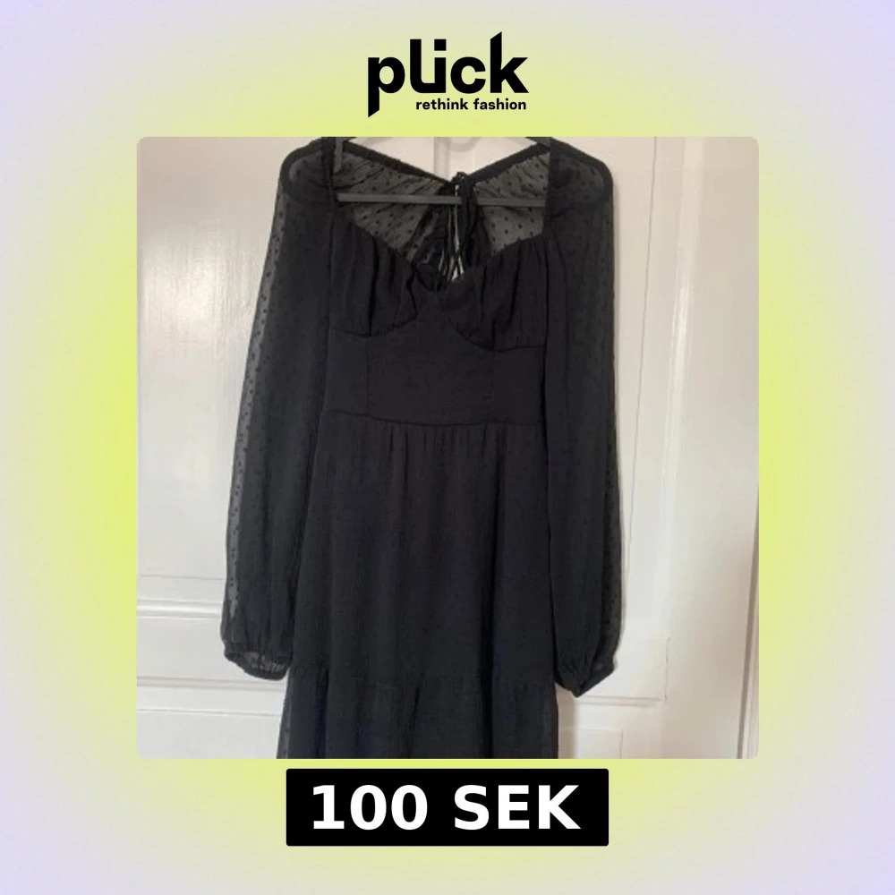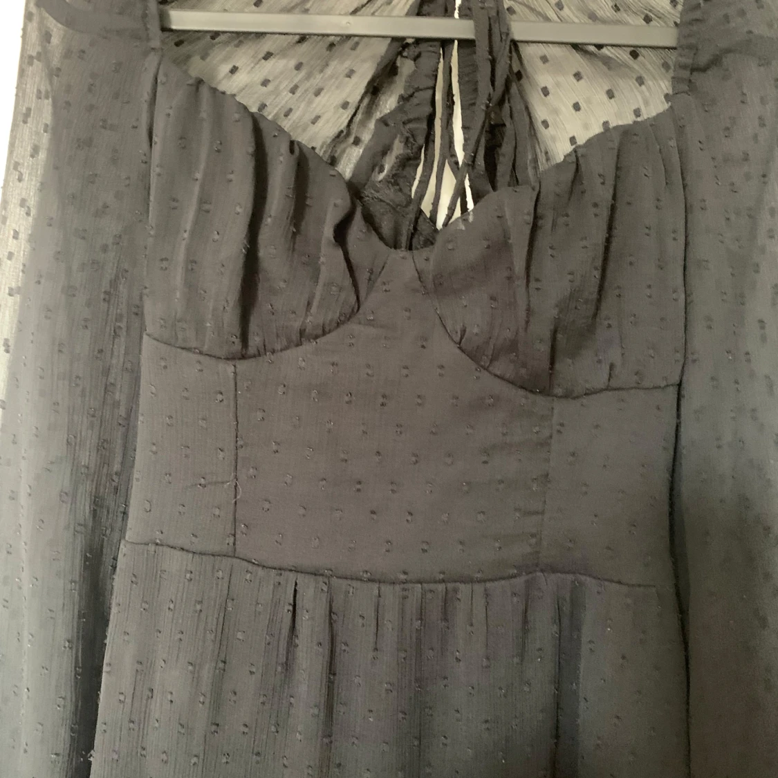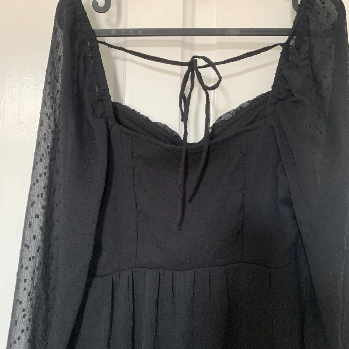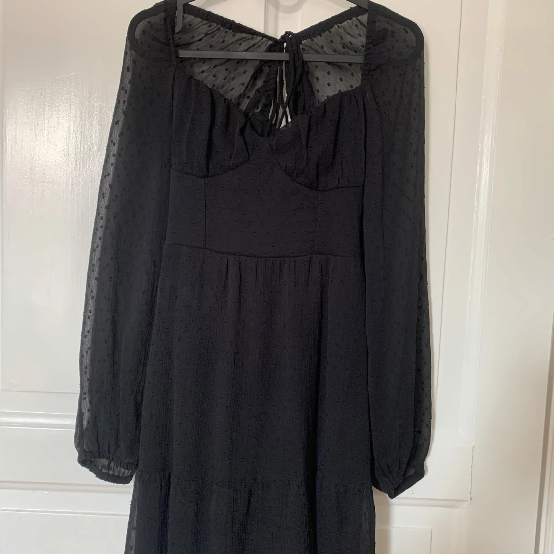 Supersnygg svart långklänning med transparenta, långärmade ärmar i prickigt tyg. Klänningen har markerad byst, knytning i ryggen och flowy kjol. Perfekt för dig som gillar romantiska detaljer och en elegant look. Köparen betalar frakten