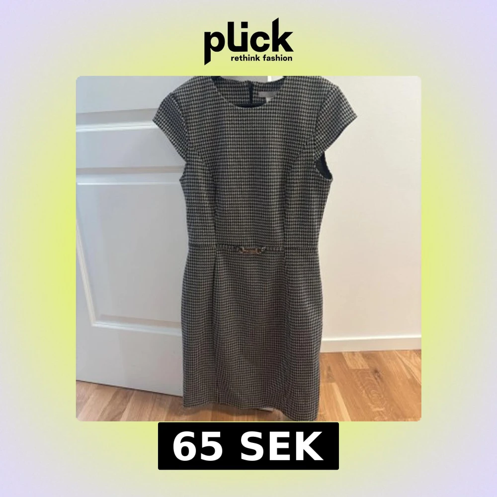 Snygg kortklänning från H&M i svartvitt rutigt mönster med guldfärgad detalj i midjan. Klänningen har rund hals, korta ärmar och figurnära passform. Perfekt för dig som gillar klassisk stil med en twist.