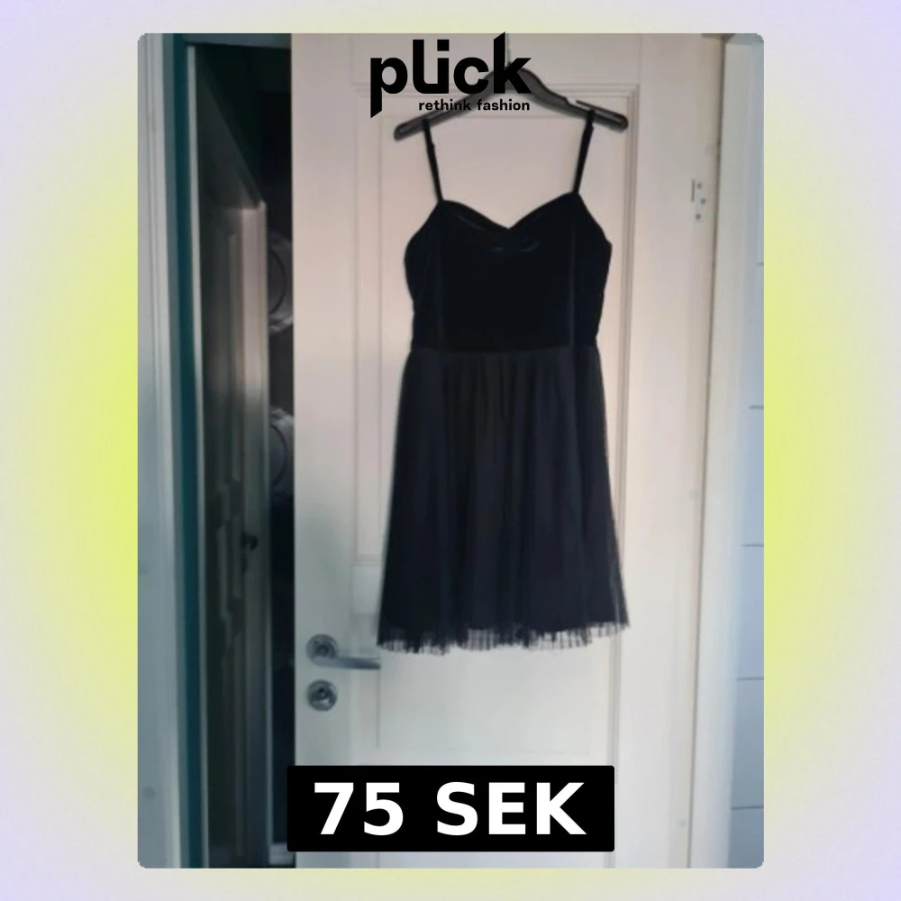 Snygg svart kort klänning med smala axelband och hjärtformad urringning. Överdelen är i sammet och kjolen i tunt, skirt tyg med volangkant. Dragkedja i ryggen för enkel på- och avtagning. Perfekt för dig som vill ha en stilren och elegant look.