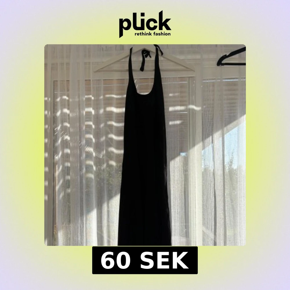 Svart långklänning från H&M med smala axelband som knyts i nacken. Klänningen har en djup urringning fram och är ärmlös, vilket ger en clean och stilren look. Perfekt för dig som gillar minimalistisk stil och vill ha något enkelt men snyggt.