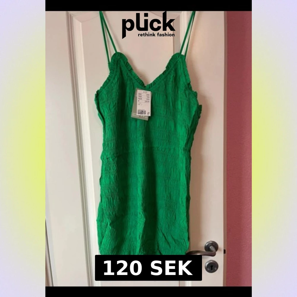Superfin grön kortklänning från H&M med smockad struktur, tunna axelband och volangdetalj längst ner. Perfekt för varma dagar och enkel att styla med sneakers eller sandaler. Klänningen har en v-ringning och är i ett lätt material.
