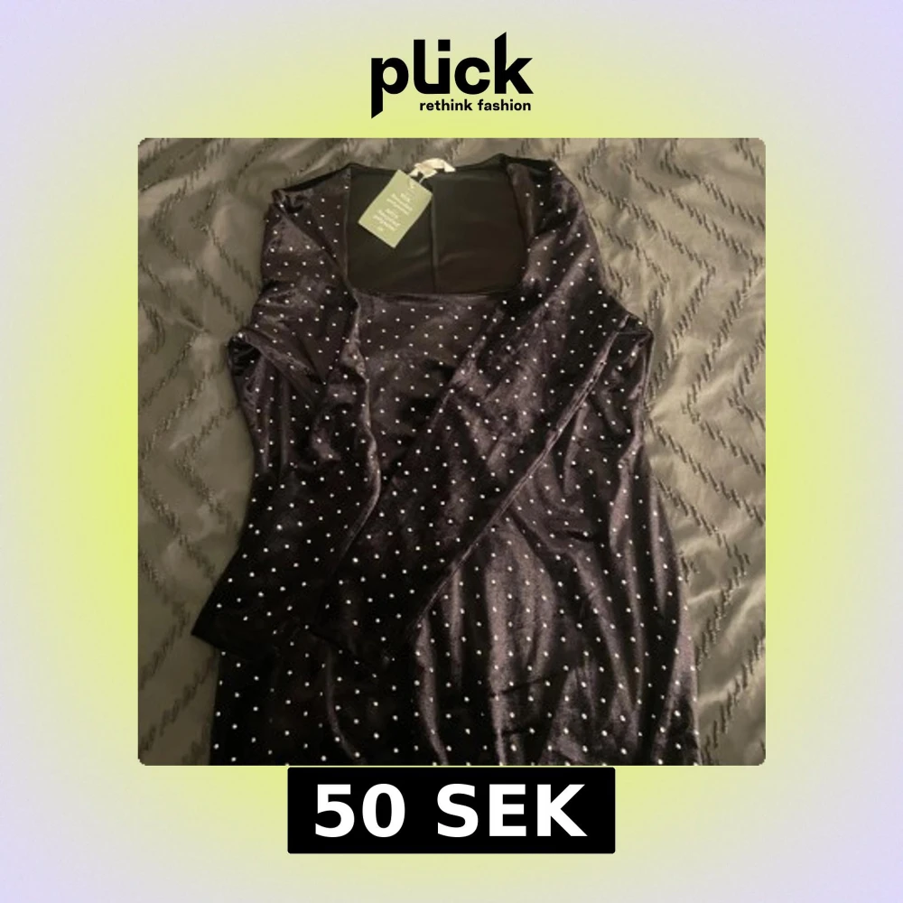 Supersnygg svart klänning från H&M med glittrigt tyg och små vita prickar över hela. Klänningen har lång ärm, fyrkantig ringning och är gjord i mjuk, stretchig polyester. Perfekt för dig som vill sticka ut med en cool och trendig look.