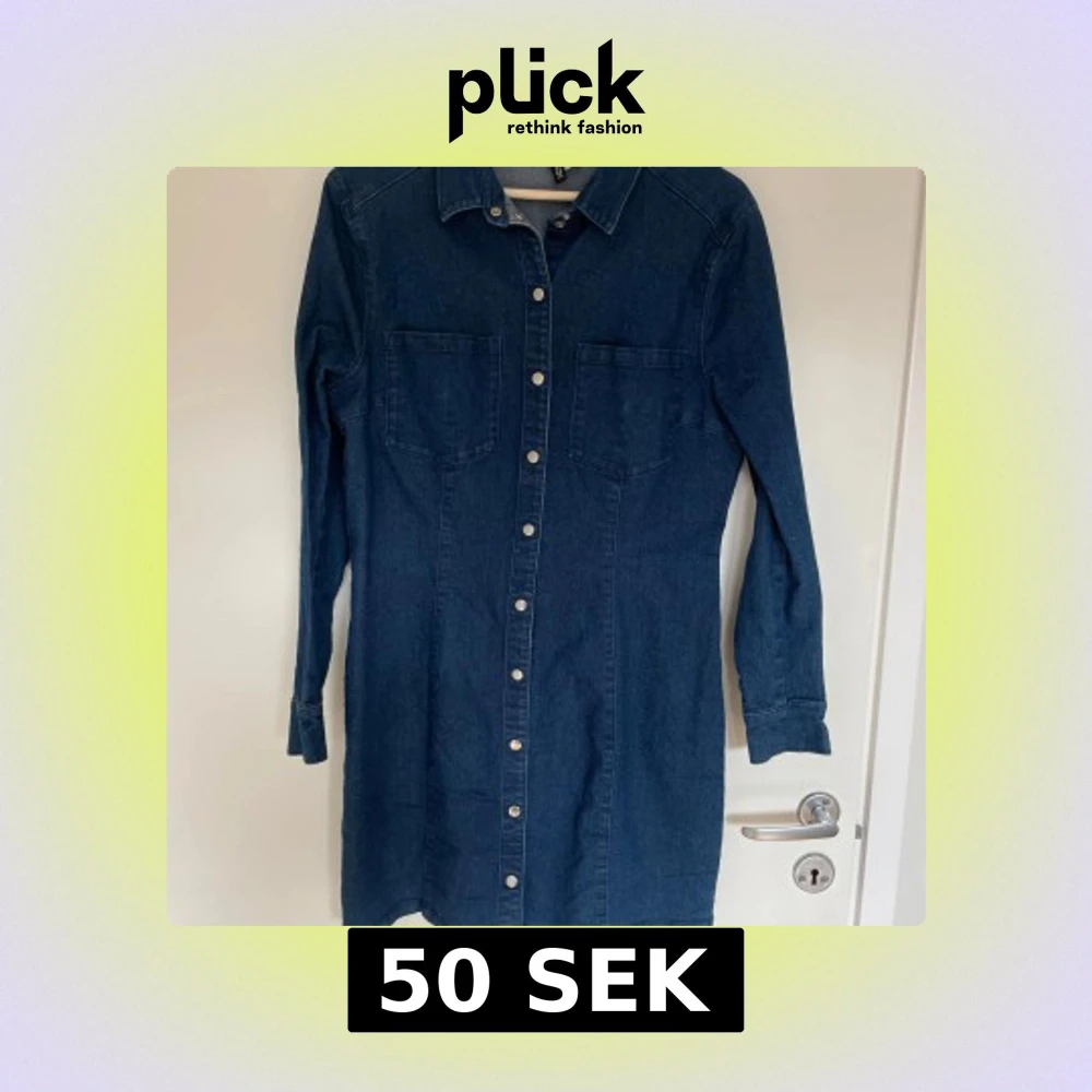 Snygg blå jeansklänning med långa ärmar och knappar framtill. Slimfit med stretch. Detaljbild något missvisande i färg - den är mer mörkblå likt helbilderna