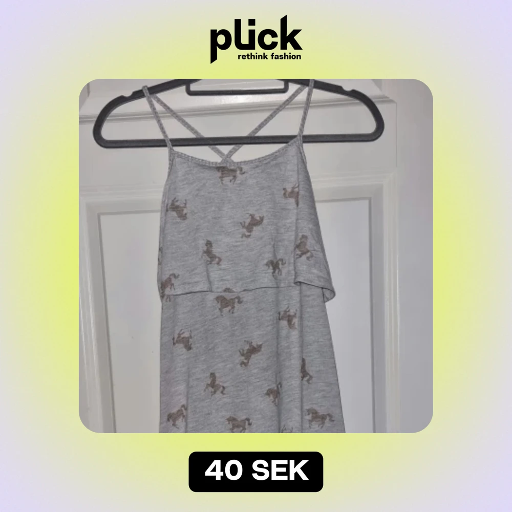 En grå långklänning med smala axelband och ett hästmönster. Klänningen har en lös passform och är ärmlös med en volangdetalj över bysten. Från H&M i stl 146/152