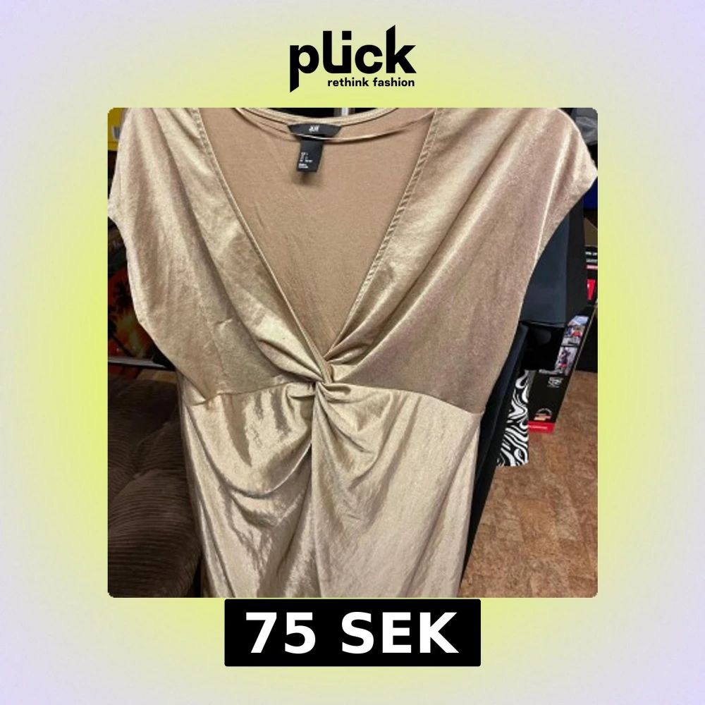 Säljer en snygg champagnefärgad klänning från H&M med v-ringning och twistad detalj framtill. Klänningen har korta ärmar och är tillverkad i ett glansigt material som ger en lyxig känsla.