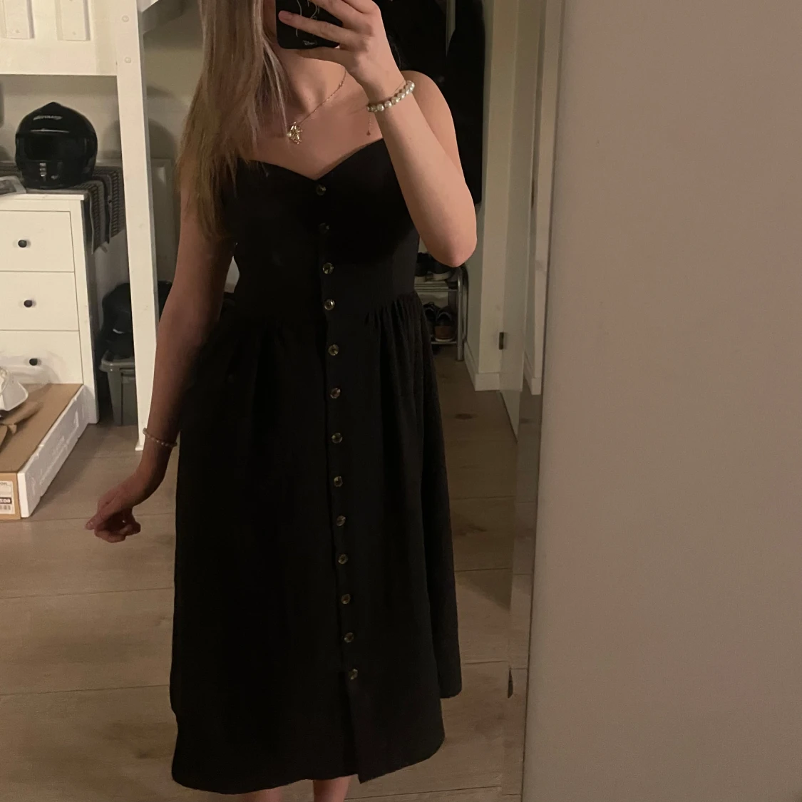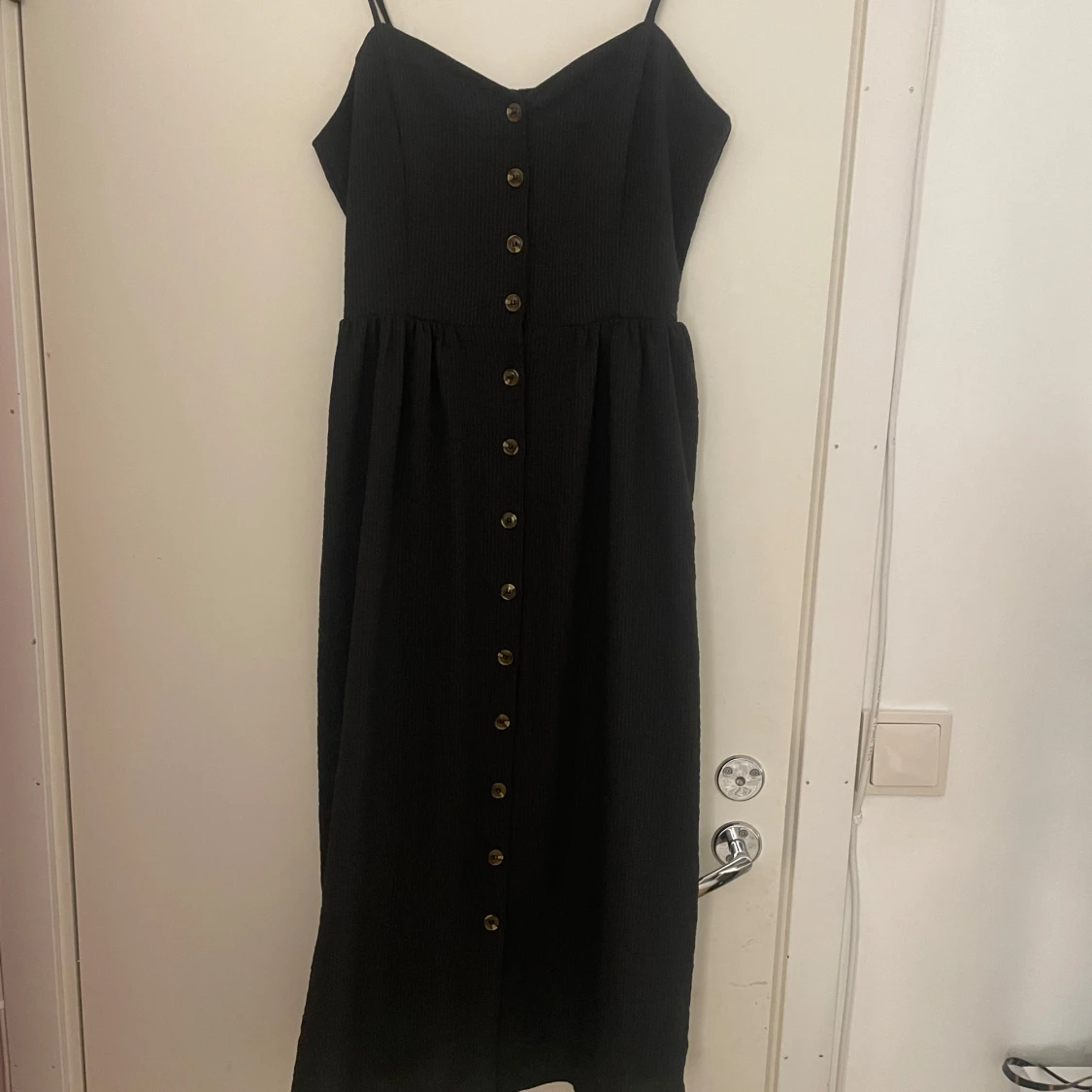 Säljer min söta svarta klänning från HM i storlek 38. Klänningen är bekväm och har knappar framtill, den är i mycket bra skick och säljer då jag ej har användning av den.